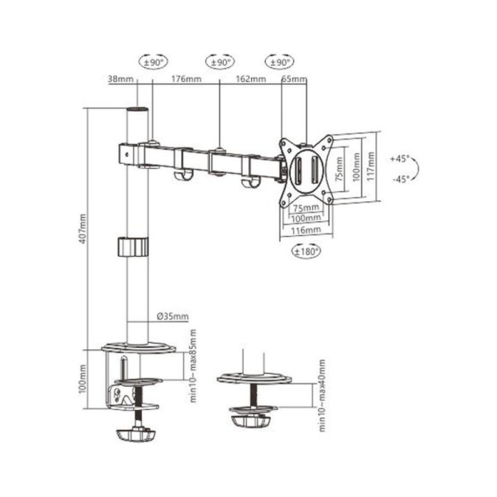 Крім того, кронштейн відповідає стандартам VESA 100 x 100 мм і 75 x 75 мм, забезпечуючи сумісність з більшістю сучасних моніторів. Компактний та ергономічний дизайн дозволяє кронштейну стати не лише функціональним, але й естетично привабливим доповненням вашого офісу або домашнього робочого простору.