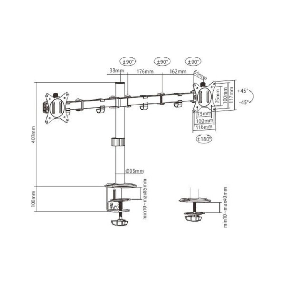 Кронштейн підтримує широкий спектр моніторів з діагоналлю від 17" до 32", завдяки чому ви зможете легко адаптувати його до ваших потреб. Сумісність з VESA 75 x 75 мм та 100 x 100 мм забезпечує універсальність і простоту у використанні з більшістю сучасних дисплеїв. Незважаючи на легкість конструкції, виготовленої з високоякісної сталі, кронштейн може витримати до 9 кг на кожен з екранів, що є свідченням його надійності та стійкості.