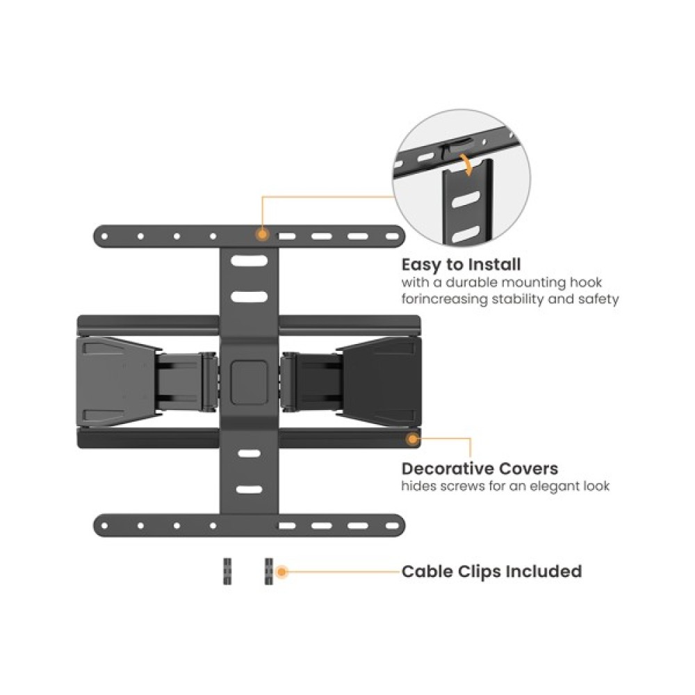 Розрахований на *максимальну діагональ телевізора до 75 дюймів*, HiSmart HS083953 має вражаючу універсальність завдяки підтримці різних розмірів діагоналі — від 37" до 75". Така широка сумісність дозволяє використовувати його з більшістю популярних моделей телевізорів, а *максимальне навантаження до 50 кг* забезпечує безпеку навіть у випадку з важкими пристроями.