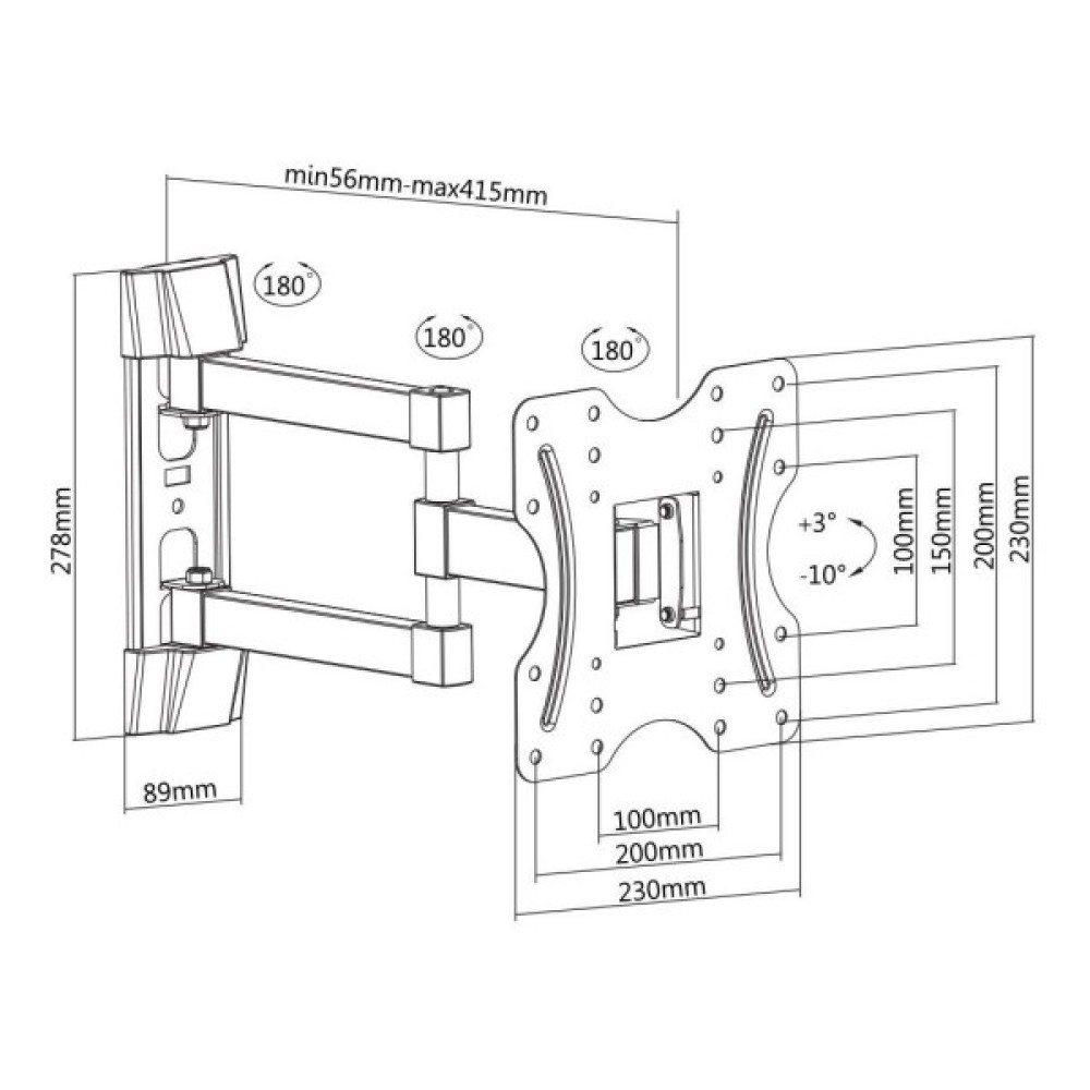 Кронштейн відзначається поворотним і похилим механізмом, що дозволяє з легкістю адаптувати кут нахилу в межах 3° - 12° і поворот на 90°. Це надає можливість налаштування ідеального положення екрана для оптимального перегляду з будь-якої точки кімнати. Регульована відстань від стіни (від 56 до 415 мм) робить цей аксесуар особливо зручним для установки в умовах обмеженого простору чи нестандартної геометрії приміщень, оскільки дозволяє легко підключати додаткові пристрої або USB-накопичувачі.