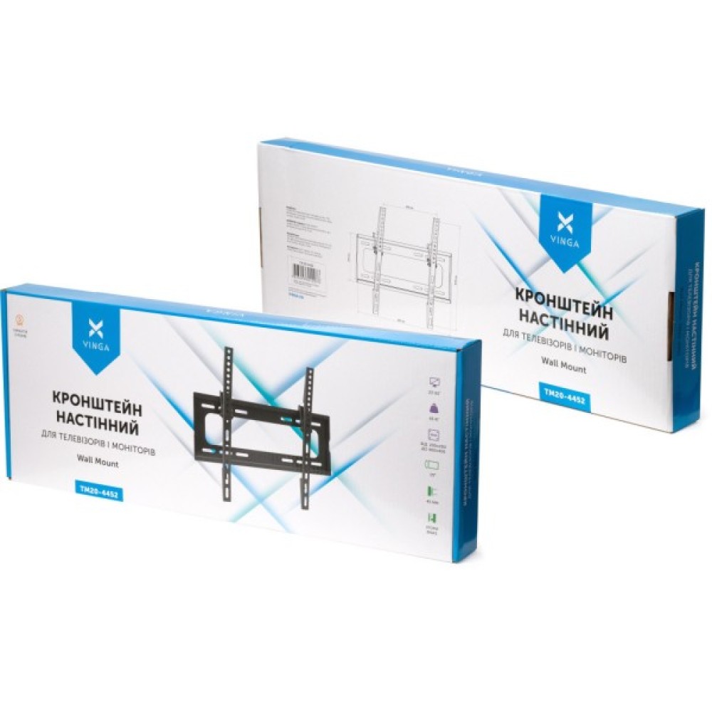 Розроблений для підтримки телевізорів з максимальною діагоналлю 55", цей металевий кріплення справиться з телевізійними екранами середнього та великого розміру, витримуючи навантаження до 45 кг. Vinga TM20-4452 сумісний зі стандартами VESA, зокрема розмірів 200 x 300, 400 x 200, 200 x 400, 300 x 200, 300 x 300, 400 x 400, 400 x 300, 200 x 200, що робить його універсальним вибором для широкого спектру телевізорів різних виробників.