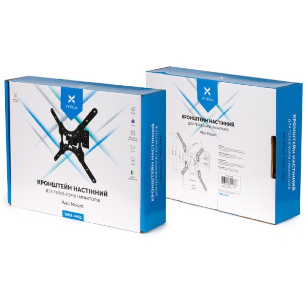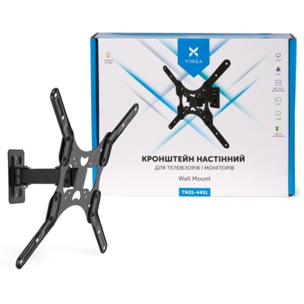 Кронштейн Vinga TM31-4451 розроблений з увагою до деталей: він має три ступені свободи, завдяки чому ви легко можете налаштувати положення телевізора під будь-якими умовами. Максимальне навантаження, яке витримує конструкція – до 25 кг, що забезпечує впевненість у безпеці вашої техніки. Металеві елементи кріплення не тільки гарантують високу міцність, але й додають конструкції стилю.