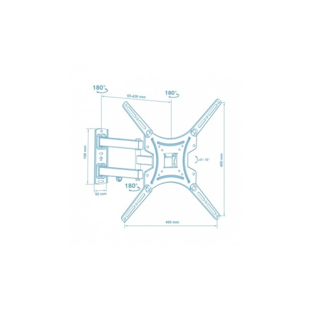 Walfix R-383B пропонує максимальну свободу у налаштуванні положення телевізора. Завдяки чотирьом ступеням свободи ви зможете змінювати кут нахилу у межах від +5 до -15 градусів і завдяки регульованому куту повороту до 180 градусів знайти ідеальний ракурс перегляду з будь-якої точки кімнати. Мінімальна відстань від стіни становить лише 55 мм, що дозволяє розмістити телевізор максимально близько до стіни, зберігаючи простір і стиль приміщення.