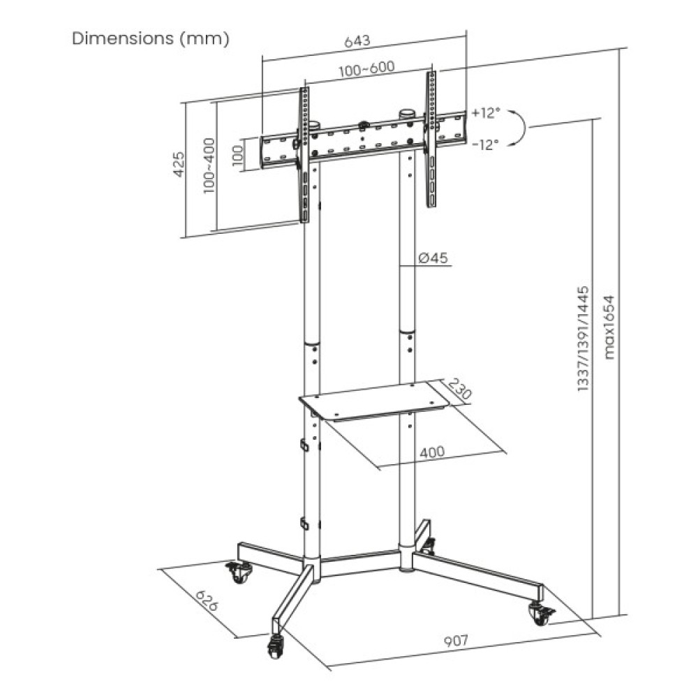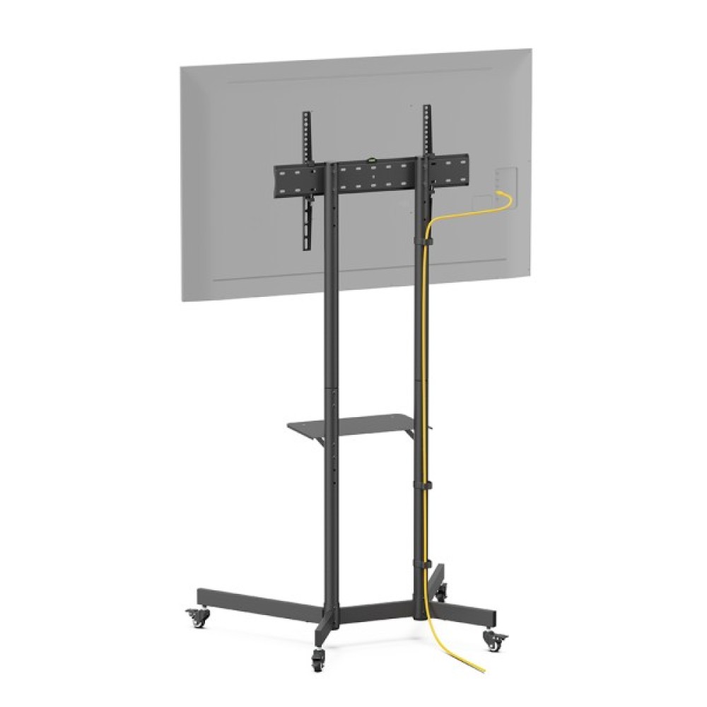 Мобільна телевізійна стійка iTECH T1042TE дозволяє безпечно закріпити LCD-панель з діагоналлю від 37" до 70" та вагою до 45 кг. Вона обладнана регулюванням висоти на трьох рівнях (1337 / 1391 / 1445 мм), а максимальна висота конструкції становить 1654 мм. Для додаткової зручності передбачено полицю розміром 400 × 230 мм.