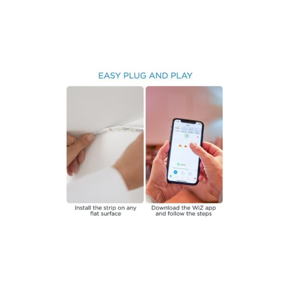 Розумна світлодіодна стрічка WiZ LEDStrip. Миттєва готовність до використання. Керування з будь-якого місця. Регульований теплий та холодний білий колір, а також попередньо задані режими. Автоматичне увімкнення освітлення за розкладом.
