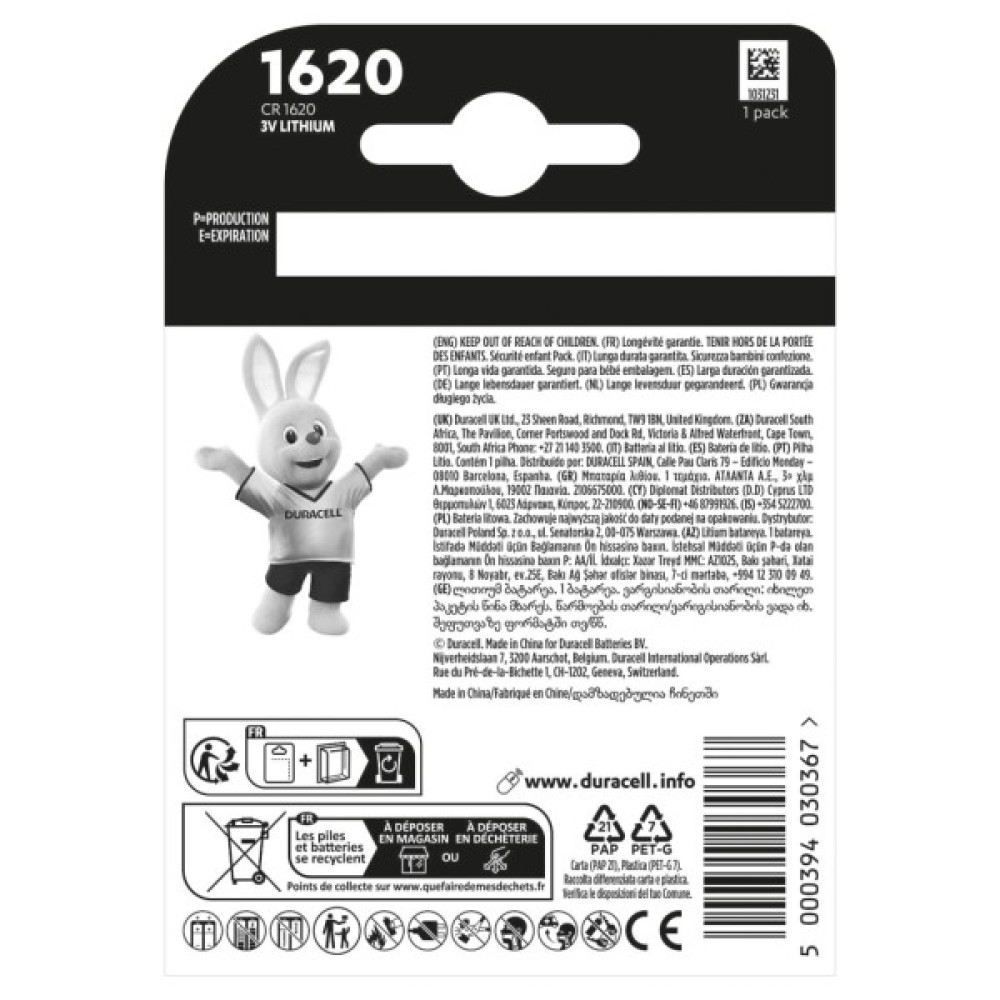 Батарейка, CR, 1620, спеціальна, літієва, типу, таблетка, 1620, 3V, 1, шт, упаковці, Duracell, 5011069