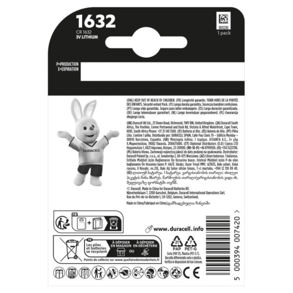 Батарейка, CR, 1632, спеціальна, літієва, типу, таблетка, 1632, 3V, 1, шт, упаковці, Duracell, 5011068