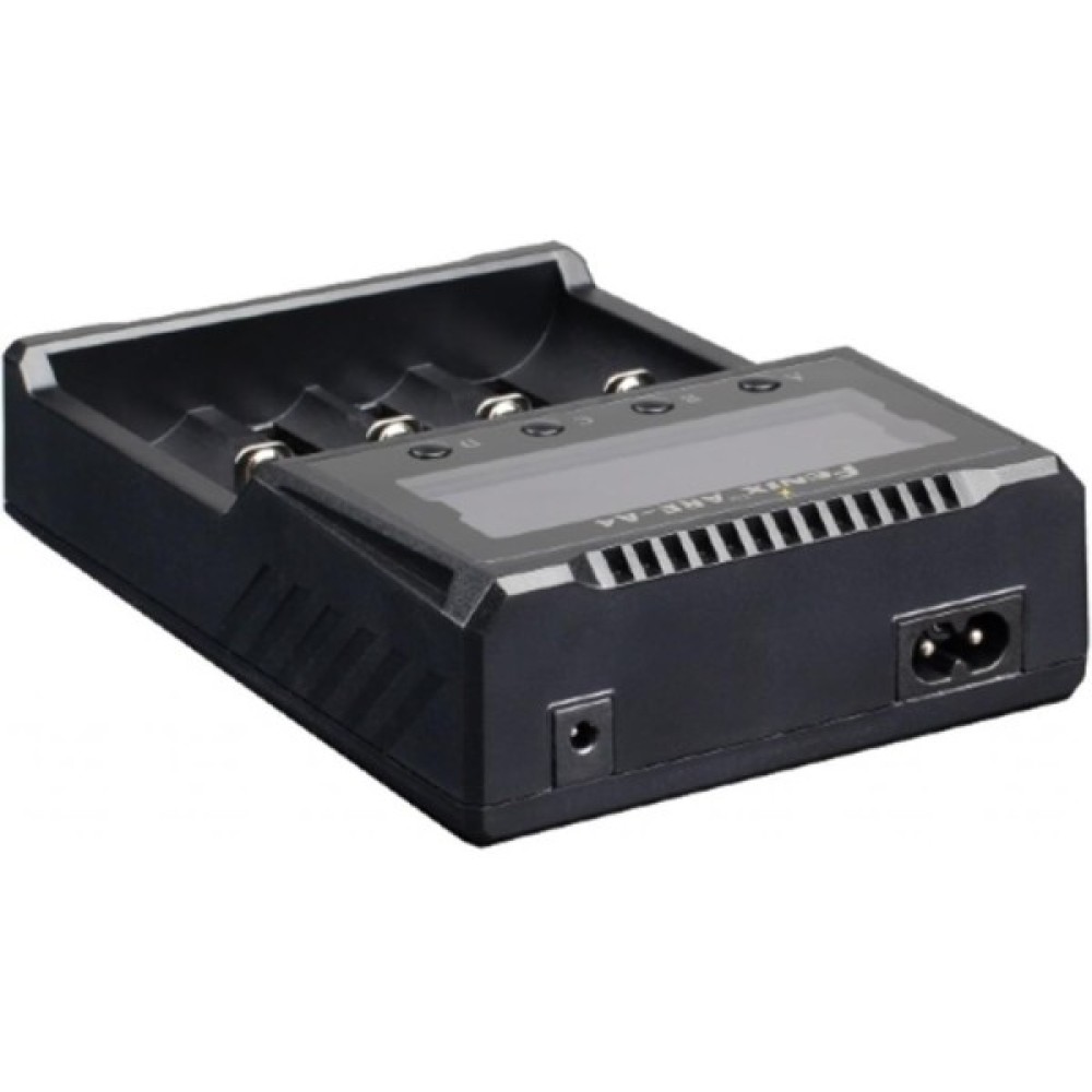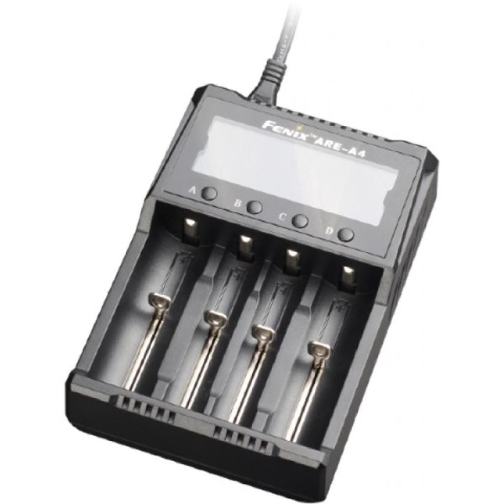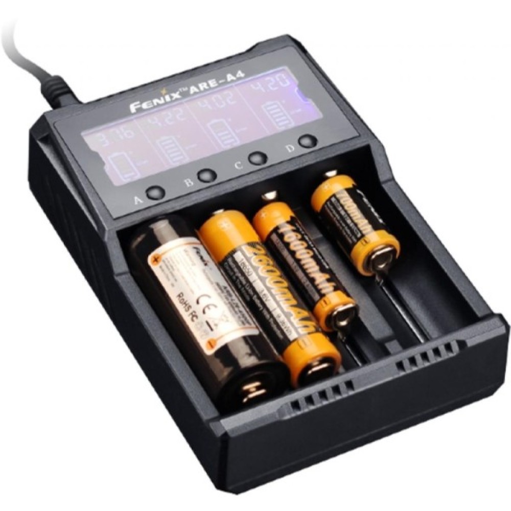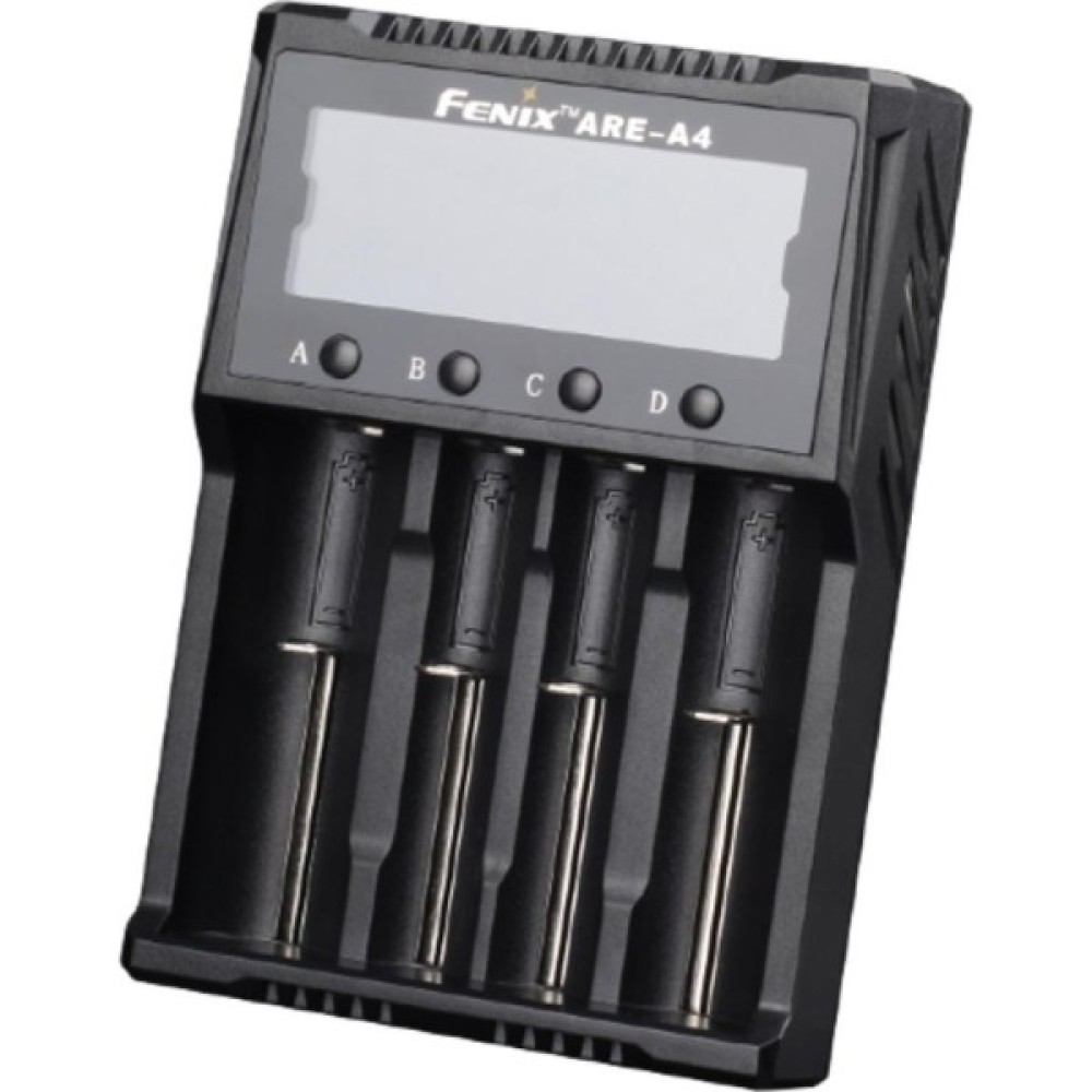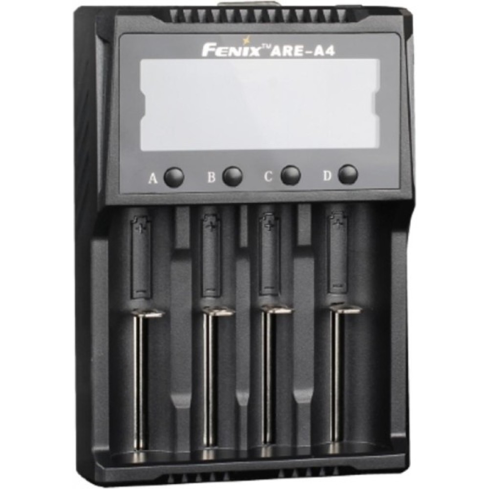 У Fenix ARE-A4 присутні 4 слота для установки акумуляторів. Вони розташовані поруч, але працюють абсолютно автономно, що дозволяє навіть одночасно заряджати батареї абсолютно різних форматів. Пристрій самостійно їх ідентифікує і підбере потрібну програму роботи. Користувач ж всі важливі дані може побачити на вбудованому екрані. На ньому відображаються тип і напруга батареї, сила струму для зарядки, час зарядки і поточний стан. Причому, останній з перерахованих параметрів вказується за допомогою зображення батарейки, заповненої в тій чи іншій мірі. Якщо батарейка заповнена всього однієї миготливою рискою, значить заряд акумулятора в реальності не перевищує 20%. Якщо блимає друга рисочка, то заряд дорівнює 20% -40%, третя - 40% -60%, четверта - 60% -80%, п'ята - 80% -99%. Коли зображена повністю заповнена батарейка - процес зарядки завершений і акумулятор можна виймати з пристрою.