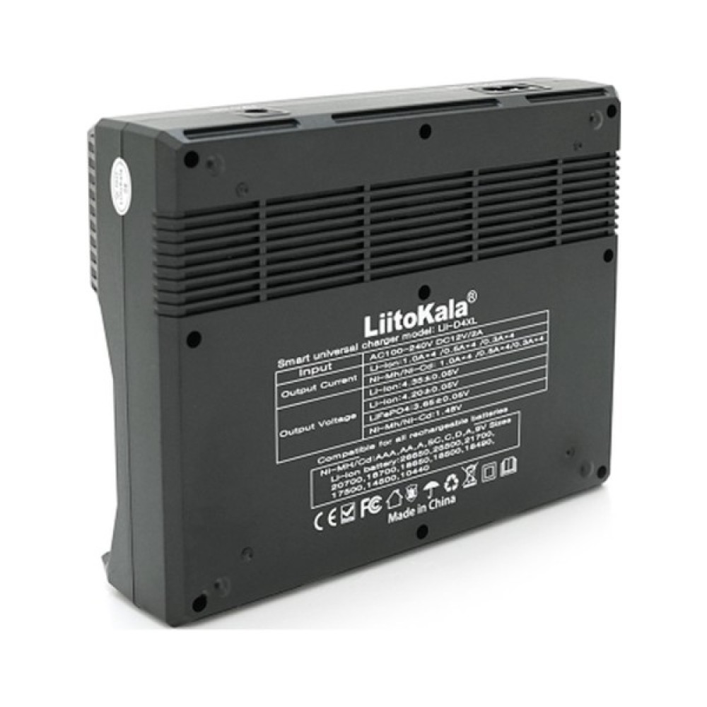 Зарядний пристрій Liitokala Lii-D4XL є універсальним зарядним пристроєм з чотирма каналами, що підтримує Ni-MH і Ni-Cd батареї типорозмірів AA (R6), AAA (R03), AAAA, C (R14), а також Li-ion/IMR батареї типорозмірів 32650, 21700, 18650. Пристрій також може використовуватись для заряджання автомобільних батарей з напругою 12V.