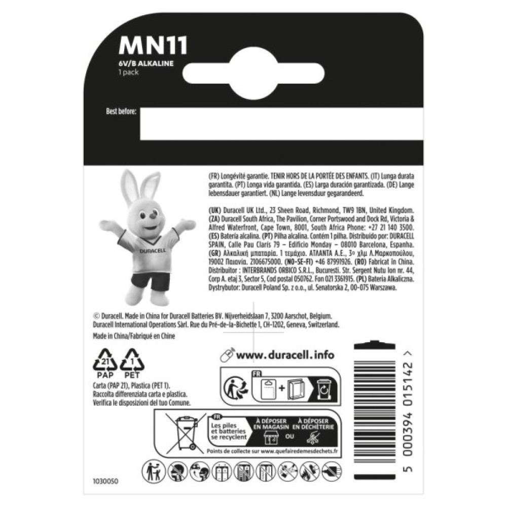 Батарейка, MN11, 6V, спеціальна, лужна, A11, 11A, 1, шт, упаковці, Duracell, 5007387