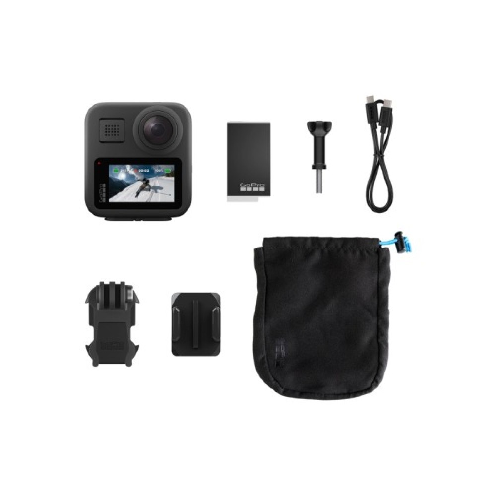 • комплект камери GoPro MAX доповнений акумулятором Enduro ємністю 1600 мА*год, вигнутим клейким кріпленням, 2 захисними кришками для об'єктива, чохлом із мікрофібри, кріпильною пряжкою + гвинтом 1/4, кабелем USB-C — USB-C