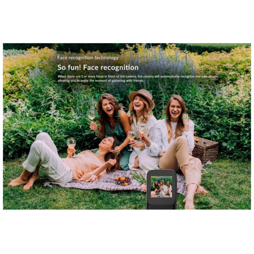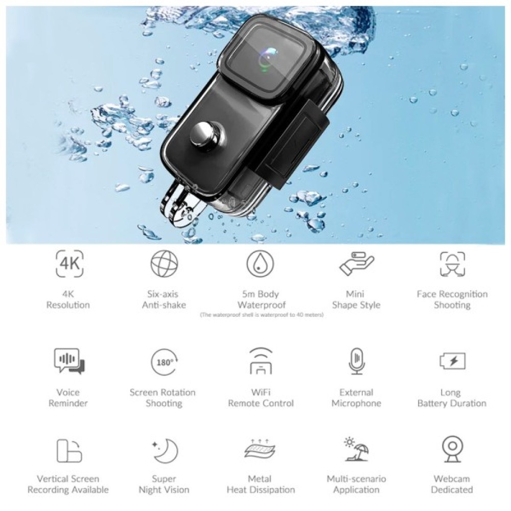 Пристрій оснащений 6-осьовим гіроскопічним стабілізатором для плавного запису відео, а також підтримує функції, такі як уповільнена зйомка (Time-Lapse), накладання дати/часу та циклічний запис. Компактні розміри (68 × 34 × 26,5 мм) і легка вага роблять камеру зручною для використання в будь-яких умовах.