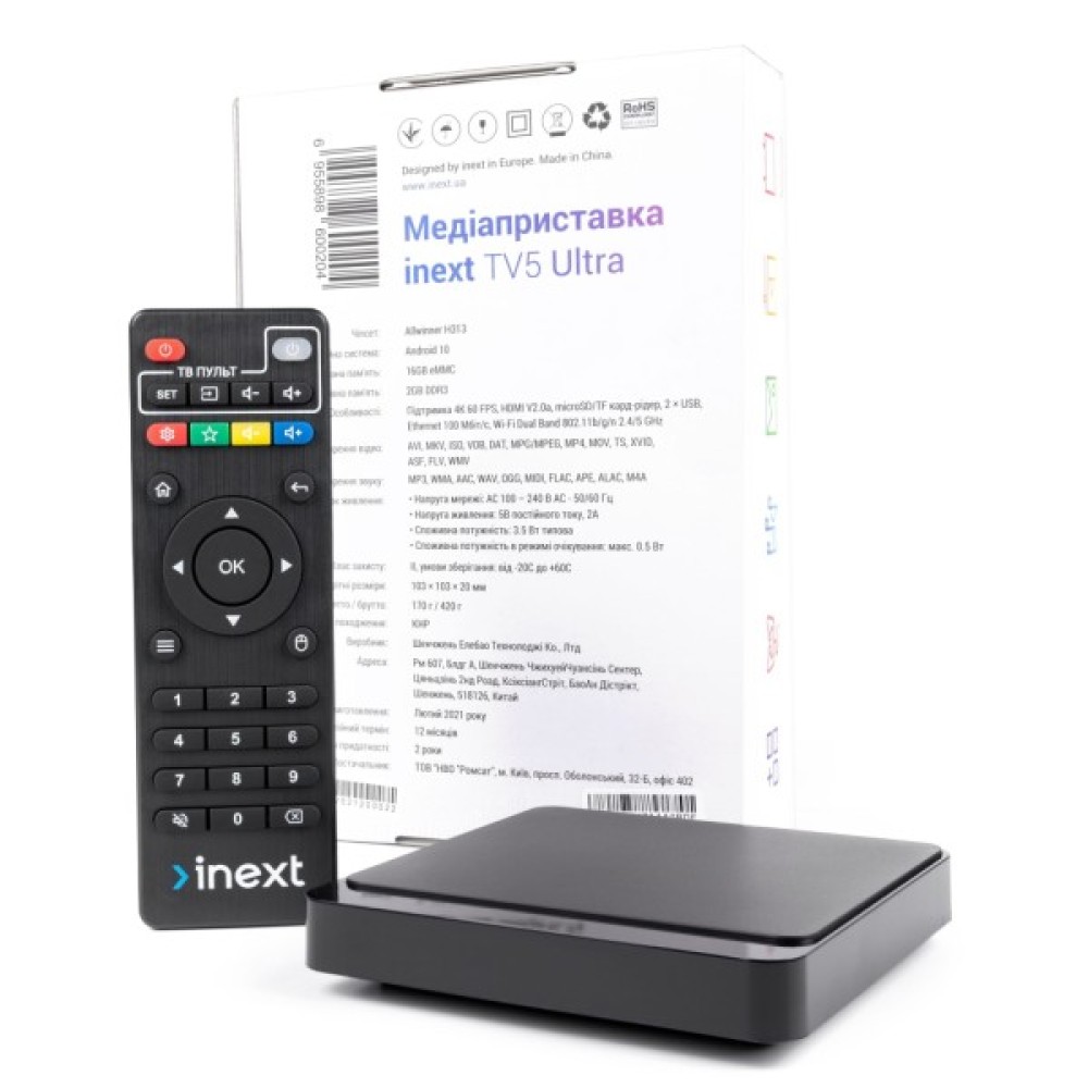 inext TV5 Ultra – медіаплеєр з операційною системою Android 10, новим потужним чипсетом Allwinner H313, дводіапазонним модулем WiFi 2.4/5 GHz і можливістю перегляду відео контенту в форматі 4K UHD. Об'єм вбудованої пам'яті становить 16 ГБ, а оперативної пам'яті - 2 ГБ (DDR3). Пристрій створений для комфортного перегляду відео-, фото- та аудіо контенту, має багатий функціонал і широкі можливості підключення. Inext 5 Ultra оснащений збільшеним об'ємом вбудованої та оперативної пам'яті, що дозволить вам насолоджуватися ще більшою швидкодією пристрою та зберігати безліч додатків і контенту.