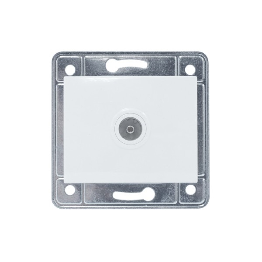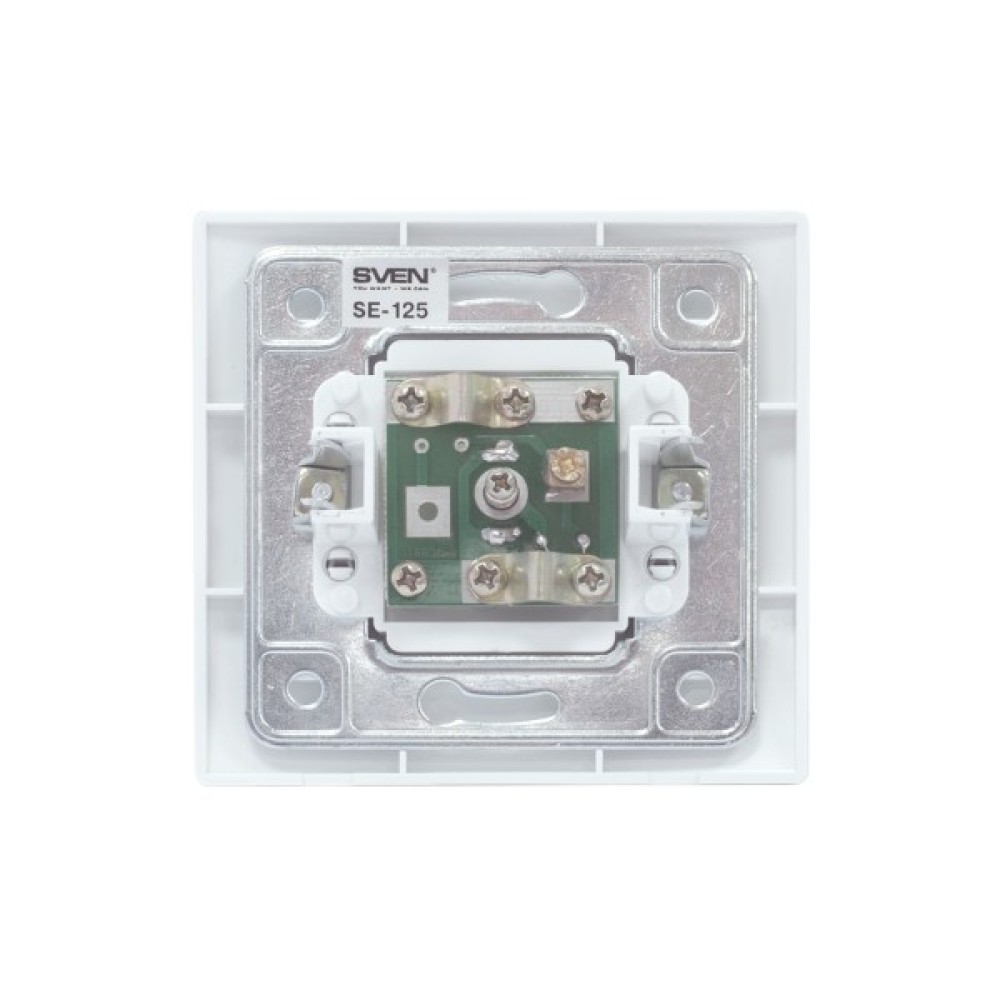 Електровстановлювальне обладнання SVEN SE-125 white (6438162010652) розетка телевізійна. Основа з оцинкованої сталі. Матеріал корпусу - негорючий PC-пластик.Особливості: тип: телевізійна; захисні шторки на розетках: немає; заземлення: немає; розміри: 85 × 81 мм; варіанти: одинарна; колір: білий.