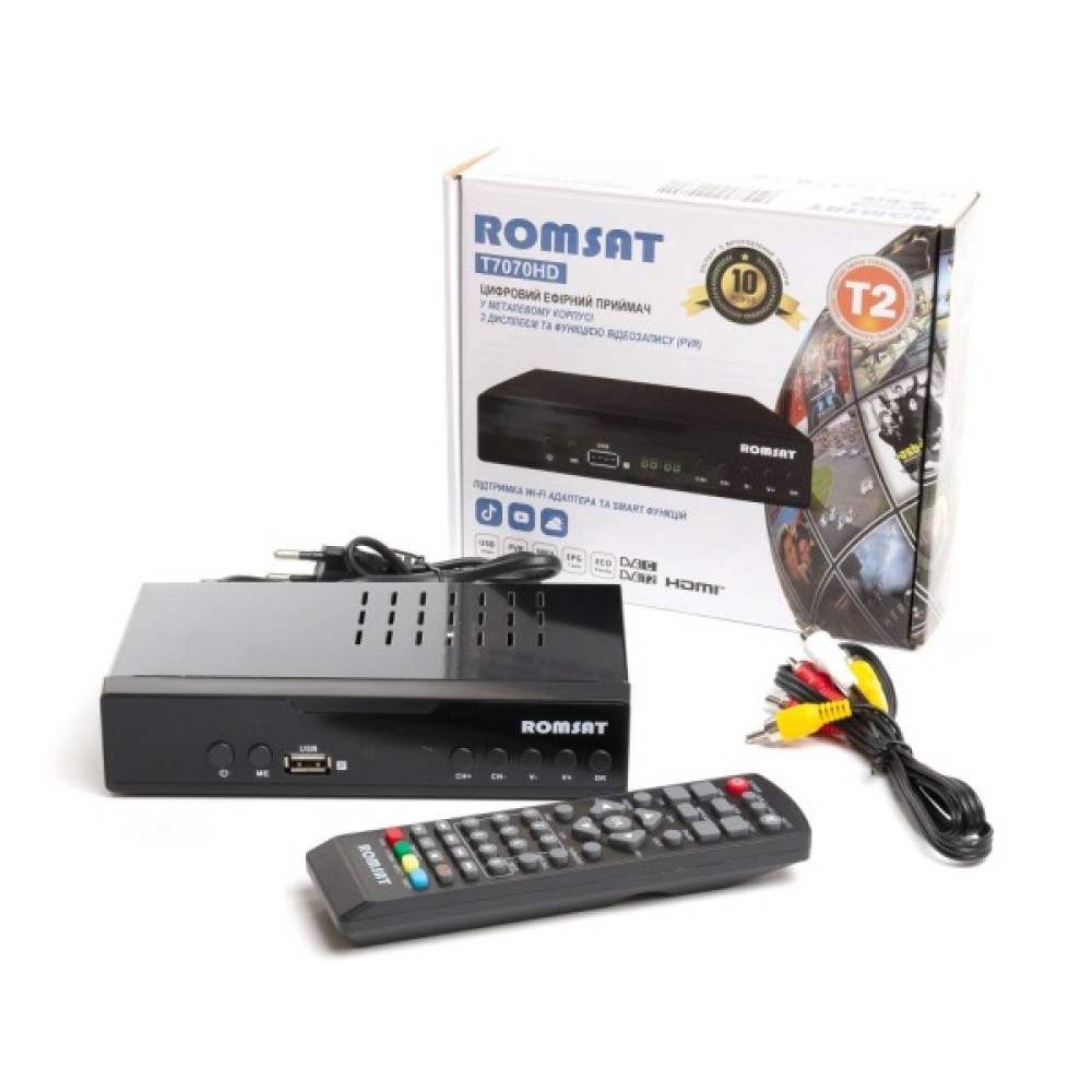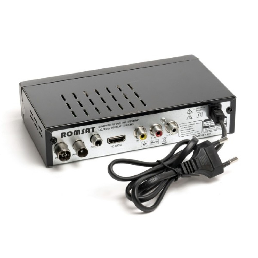 ТВ тюнер Romsat DVB-T2, метал (T7070HD) - ідеальний вибір для тих, хто цінує високу якість зображення та широкий доступ до цифрового телебачення. Цей приймач підтримує роздільну здатність до 1920 x 1080 пікселів, забезпечуючи чітке й насичене зображення. Завдяки сумісності з форматами DVB-T, DVB-T2 і DVB-C, ви отримаєте максимальну сумісність із сучасними телевізійними стандартами.