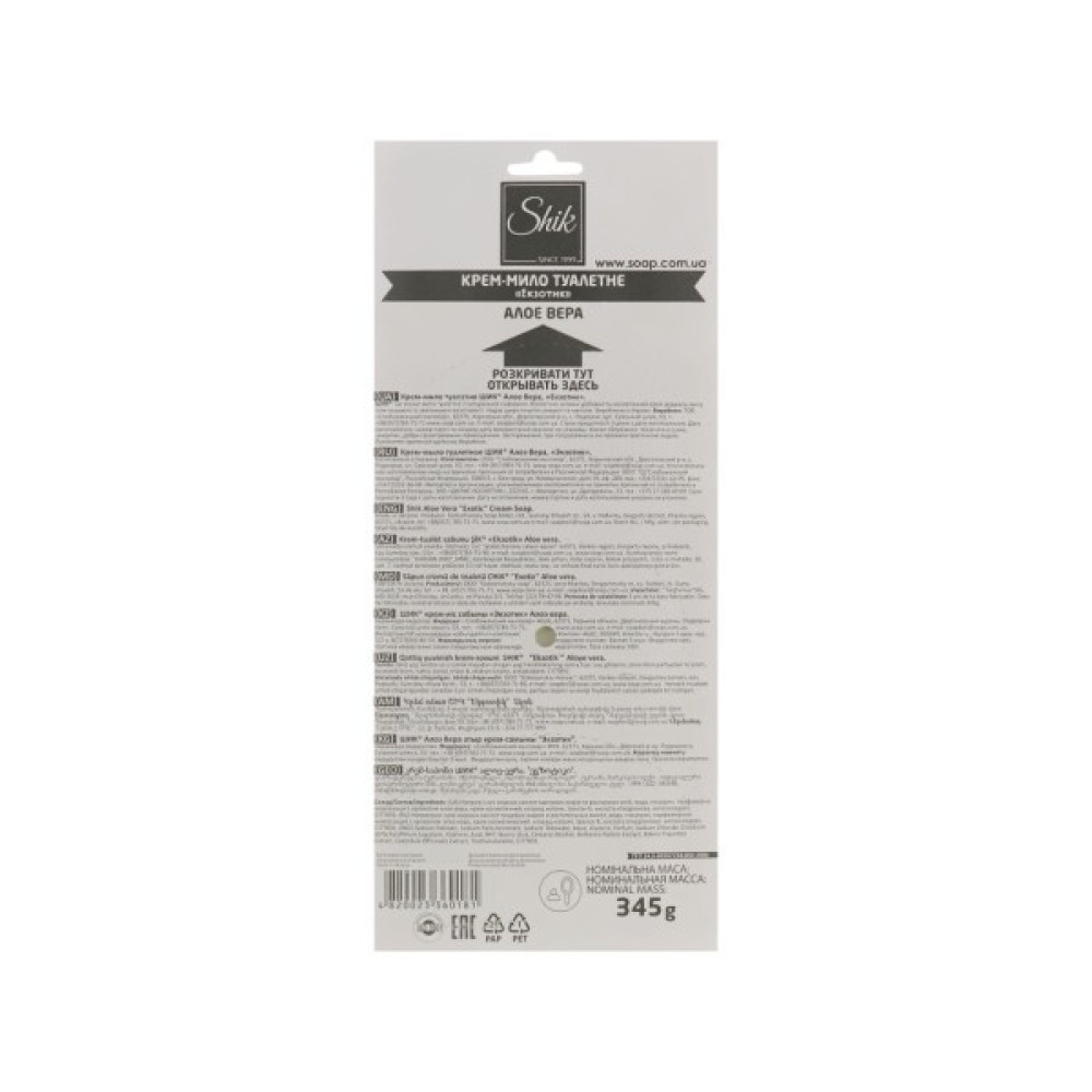 Натрієві солі жирних кислот харчових жирів та рослинних олій, вода, гліцерин, парфумерна композиція з ароматом алое вера, крем косметичний, хлорид натрію, трилон Б, кислота етидронова, антиоксидант, CI77891, CI61570.