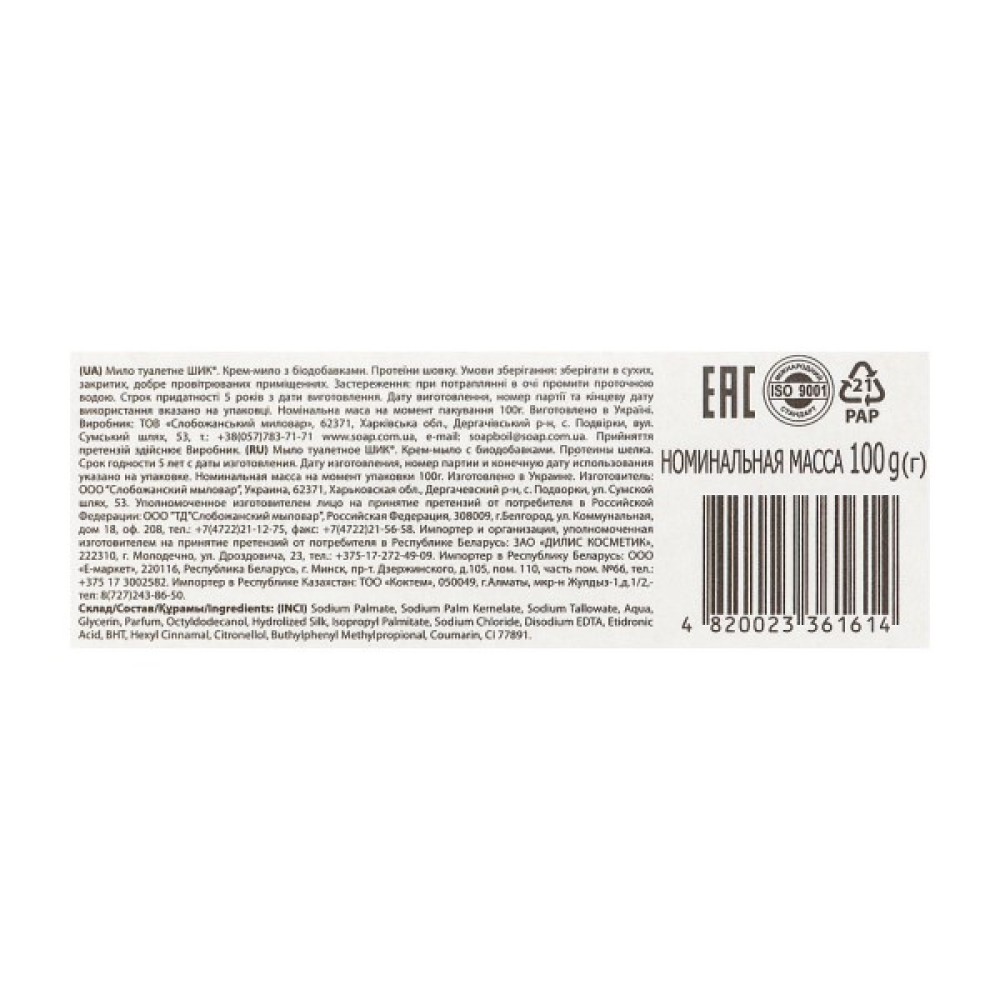 Якщо вам потрібно вибрати високоякісне і практичне у використанні мило — зверніть увагу на представлений засіб українського бренда «Шик». Воно вирізняється делікатною кремовою формулою, збагаченою біодобавками, які роблять цілющий вплив на стан епідермісу будь-якого типу, гарантуючи його м'яке очищення і додаткове зволоження. Мило добре піниться і має легкі вершкові пахощі, тому створює ніжну ароматну вуаль, м'яко обволікає шкіру.
