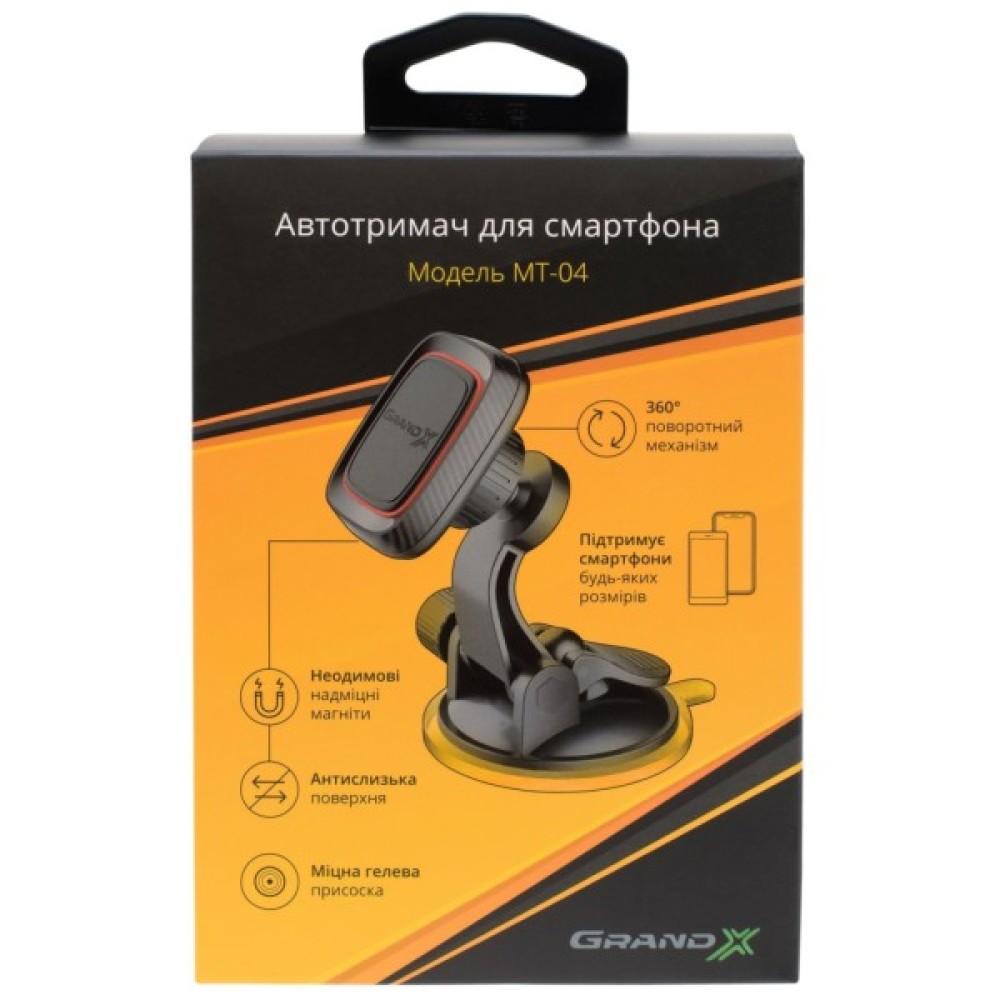 Простий при встановленні і користуванні, автомобільний тримач Grand-X, підійде для смартфонів будь-яких розмірів. Універсальність кріплення дозволяє використовувати даний тримач практично в будь-якому автомобілі. В автомобільному тримачі Grand-X MT-04 передбачена можливість зміни кута нахилу самого тримача в широкому діапазоні, що дозволяє користувачу розмістити його максимально зручно. Одним рухом руки Ви можете легко змінювати положення смартфону з вертикального на горизонтальне і навпаки, а міцні неодимові магніти надійно фіксують смартфон на всіх поворотах і нерівностях дороги. Клейка гелева основа присоски з двійною фіксацією дає додаткову фіксацію, що сприяє максимальній надійності кріплення. Зручність у користуванні: одним рухом руки вертикальне положення смартфона легко змінюється на горизонтальне і навпаки. Так само елементарно телефон кріпиться і знімається.
