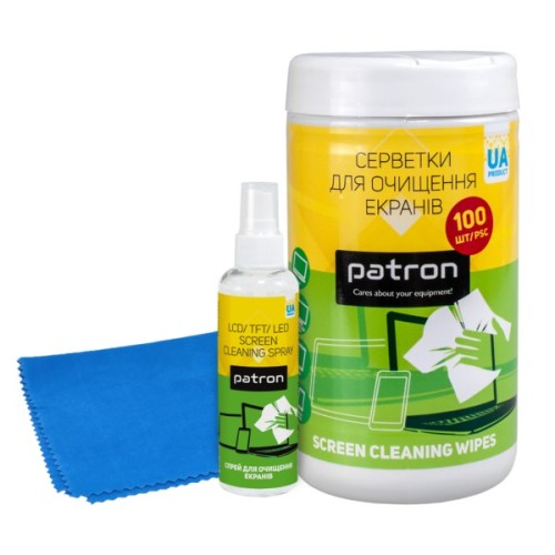 Комплект 3в1: серветки для очищення екранів, туба 100 шт. (F3-027) + очисник для екранів спрей, 100 мл (F3-008) + серветка мікрофібра 20х20 см (F4-019) Patron