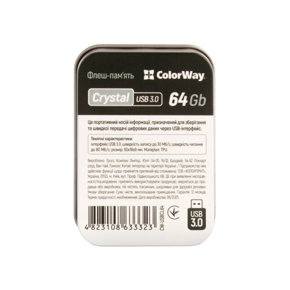 USB, флеш, накопичувач, ColorWay, 64GB, ColorWay, Crystal, USB, 30, CWUSBCL64