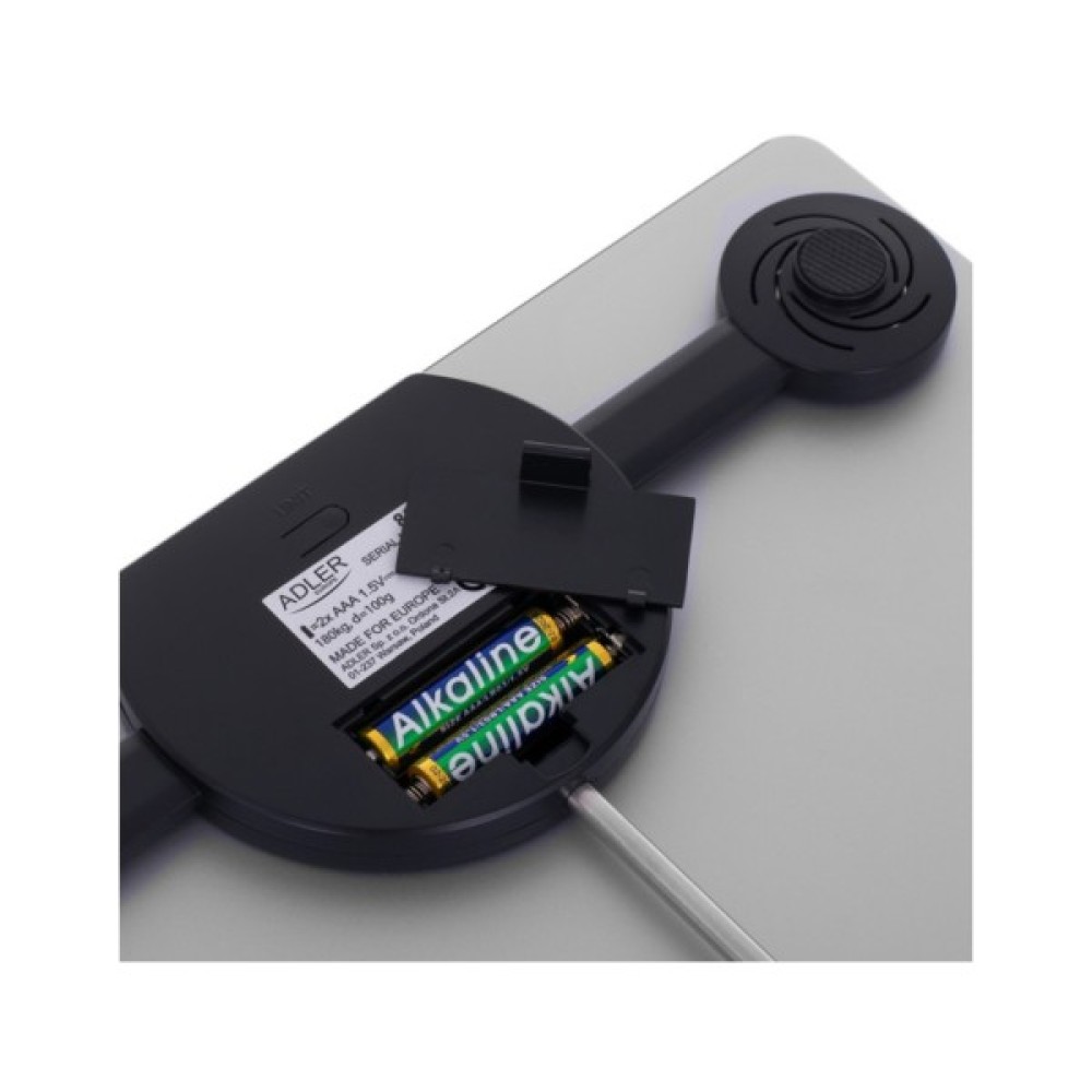 Ваги Adler AD 8174 вимірюють вагу до 180 кілограмів. Точність вимірювання забезпечується 4 тензодатчиками.