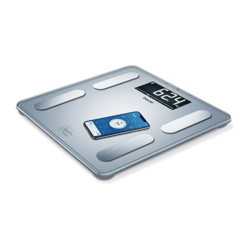 Діагностичні ваги Beurer BF 405 зі збільшеною максимальною вагою, великими цифрами та інтерпретацією результатів. Визначають вагу тіла, жирову масу, вміст води в організмі, м'язову масу, кісткову масу, визначають обмін речовин та рівень фізичної активності (BMR/AMR), розраховують індекс маси тіла.