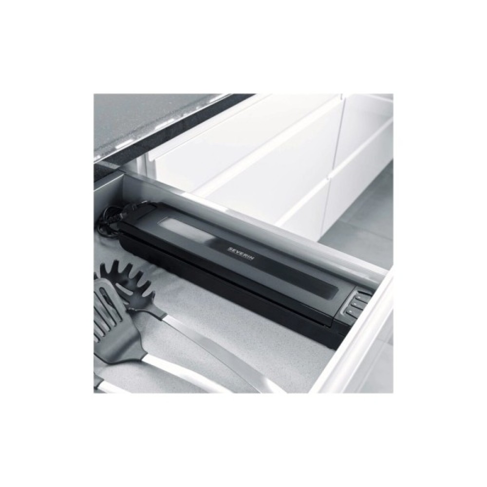 Вакуумний пакувальник FS 3601 призначений для безпечного та зручного зберігання харчових продуктів. Цей незамінний кухонний пристрій продовжить термін їх зберігання до 8 разів. Вакуумована їжа зберігає повний смак, аромат та поживні речовини, не передаючи запахів і не висихаючи. Пакувальник має компактні розміри та дизайн, що економить місце на вашій кухні. Ви високо оціните його присутність на кухні, адже зможете вакуумувати практично все. Зберігайте їжу свіжою довше Severin FS3601 простий та інтуїтивно зрозумілий у використанні. Ви кладете їжу в спеціальний мішок, натискаєте кнопку і бачите, що відбувається завдяки світловим індикаторам.