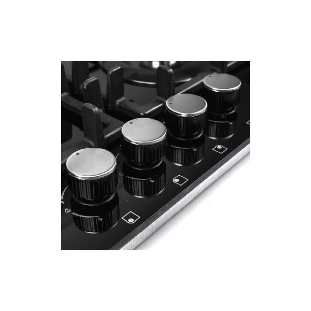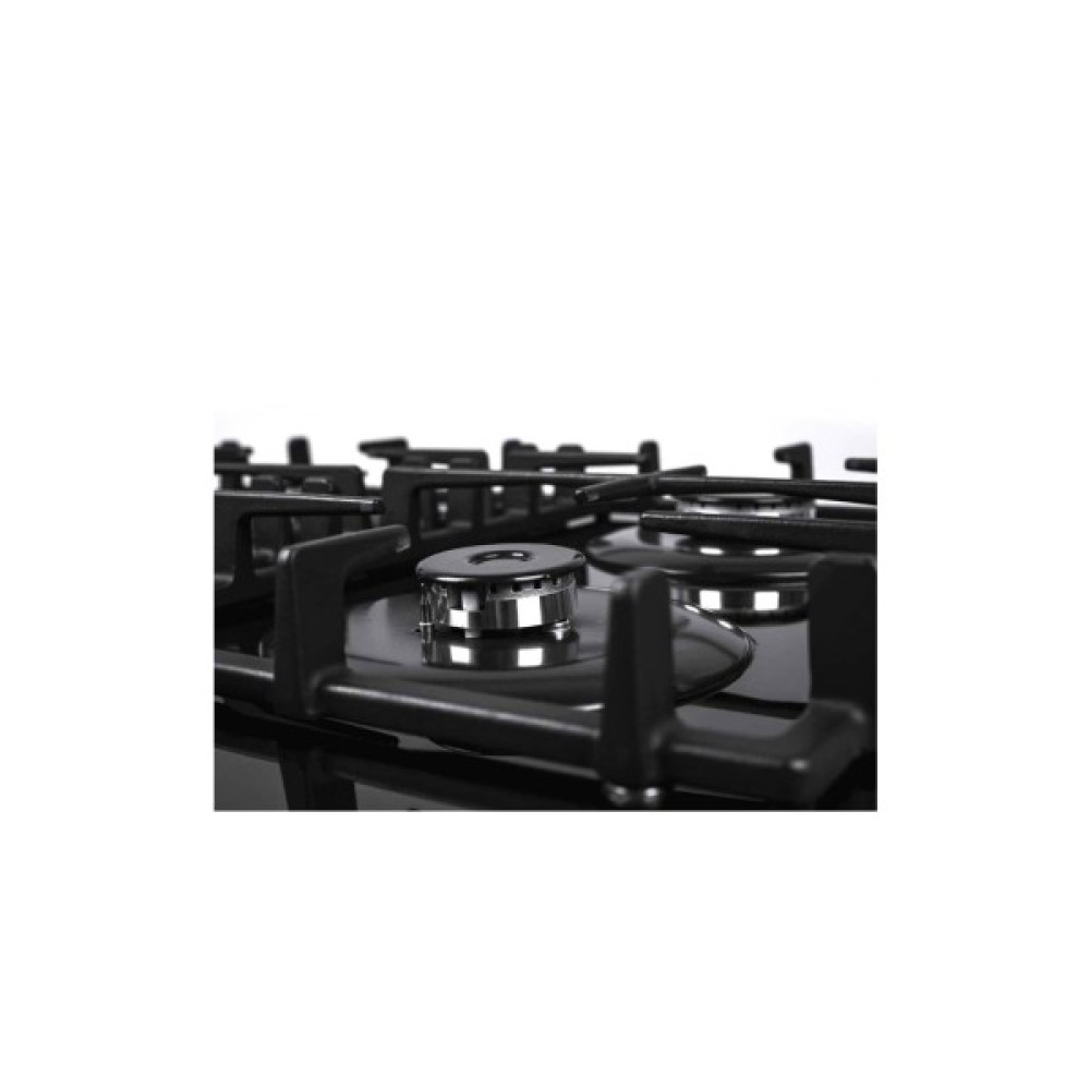 Перш за все, зверніть увагу на тип поверхні — це газова варочна поверхня, яка забезпечує швидке та ефективне приготування їжі. Матеріал виготовлення — загартоване скло, яке не тільки стильно виглядає, але й характеризується підвищеною стійкістю до температурних перепадів і механічних пошкоджень. Чорний колір додає елегантності й підкреслює сучасний вигляд.