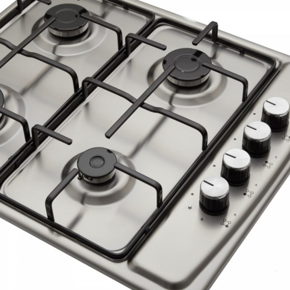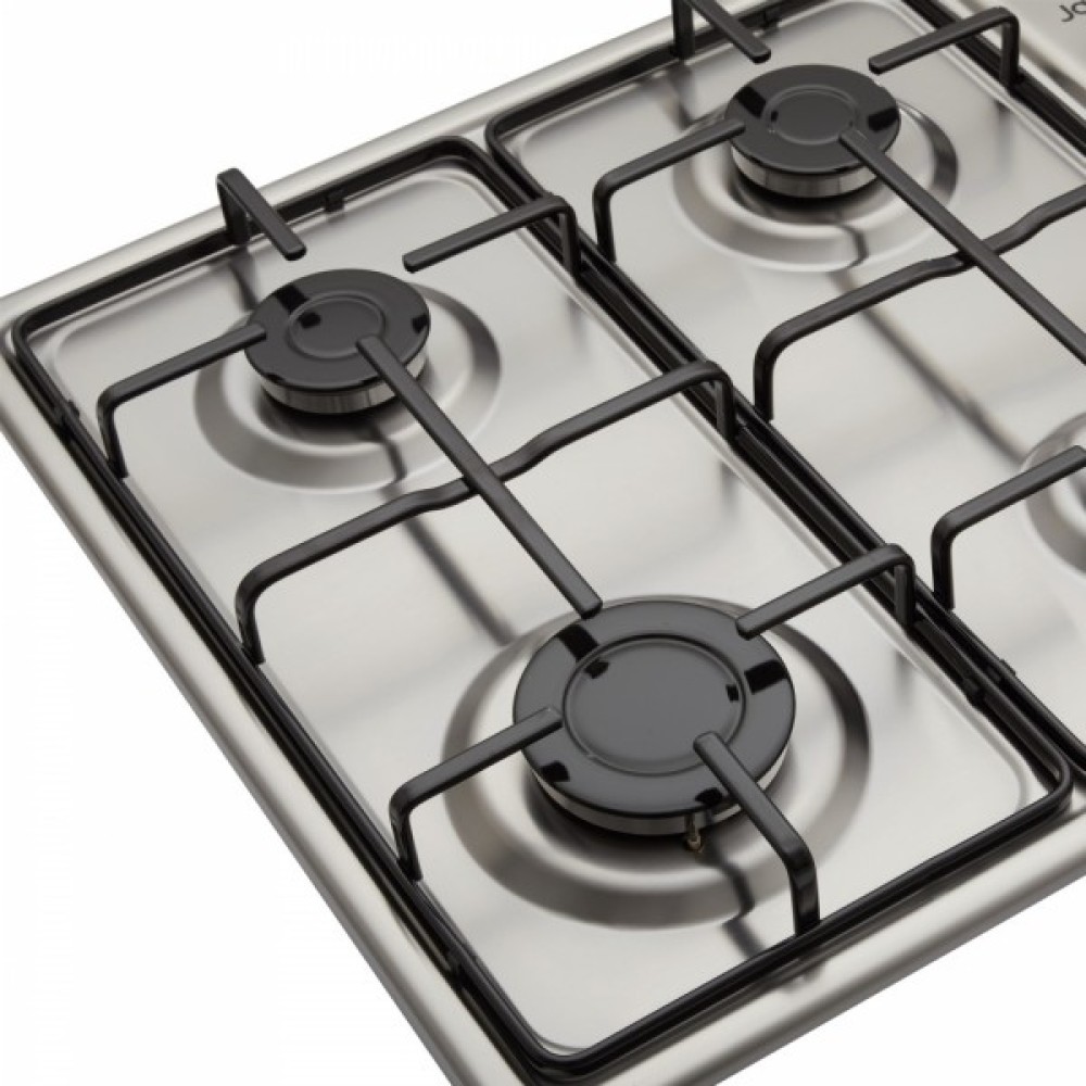 Ця модель оснащена чотирма конфорками, що дозволяють готувати різноманітні страви водночас. Управління здійснюється через прості та надійні механічні перемикачі, розміщені праворуч, що забезпечує зручність і безпеку під час використання – перемикачі не нагріваються від роботи газу. Загальна потужність у 7 кВт робить цю варочну поверхню потужним інструментом для будь-якої кухні.
