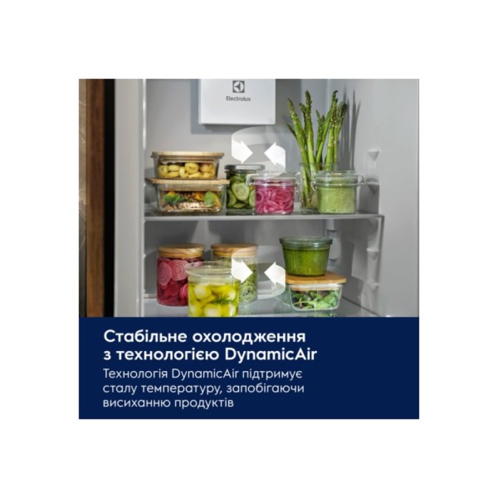 Одна з головних переваг цієї моделі — технологія DynamicAir. Вона створює потужний повітряний потік, що рівномірно розподіляє холодне повітря по всьому простору холодильника. Це гарантує стабільну температуру в кожному його куточку, завдяки чому продукти не втрачають форму та не висихають. Ваші продукти будуть захищені від нагрівання навіть під час частого відчинення дверцят.