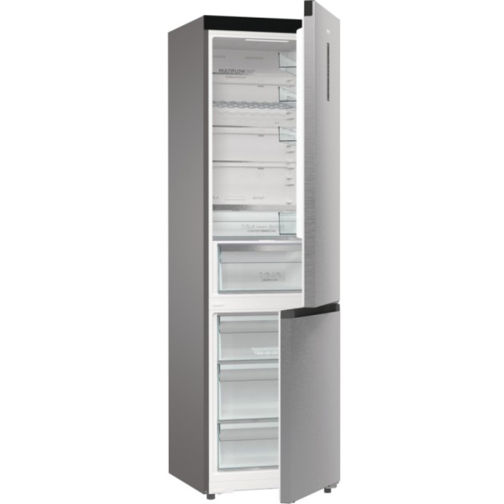 Gorenje NRB620E61X4WFE – місткий двокамерний холодильник серії G600 з нижньою морозильною камерою, що поєднує сучасні технології зручного зберігання продуктів та стильний дизайн із нержавіючої сталі. Загальний об'єм забезпечує великий запас простору для продуктів, що робить модель практичним вибором для сім'ї чи кухні з більшим обігом продуктів. Завдяки стандартній ширині близько 60 см холодильник легко інтегрується навіть у компактні кухонні ніші. Холодильник оснащений системою Total NoFrost, яка запобігає утворенню інею як у холодильному, так і в морозильному відділенні. Це означає рівномірне охолодження продуктів без необхідності ручного розморожування. Технологія Multi Air Flow підтримує стабільну температуру на всіх рівнях камери, а система AdaptTech аналізує звички користувача і автоматично регулює температуру для кращого збереження продуктів.