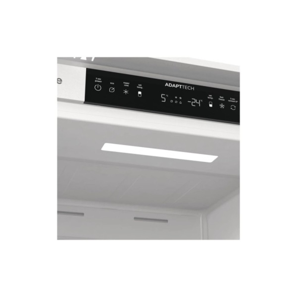 Електронне керування з внутрішнім дисплеєм дозволяє регулювати температуру та активувати режим «Відпустка» або швидке замороження. Передбачена зона свіжості для делікатних продуктів, перевішування дверей, жорстке кріплення фасаду меблів із SoftClose-шарніром та регульовані ніжки для зручного монтажу. Технологія AdaptTech адаптує роботу холодильника до звичок користувача, підтримуючи стабільну температуру після відкривання дверцят.