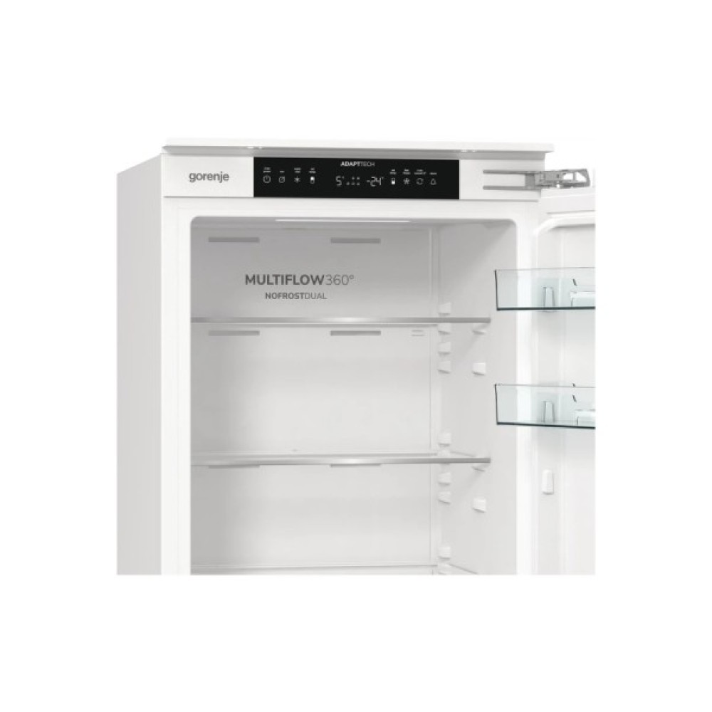 Вбудований двокамерний холодильник Gorenje NRKI517E42 серії G400 об'ємом 252 літри поєднує сучасний дизайн та ефективні технології для комфортного зберігання продуктів. Загальний об’єм включає холодильне відділення на 176 л та нижнє морозильне відділення на 76 л. Інверторний компресор забезпечує тиху роботу (35 дБ) та економне споживання електроенергії (клас E/A+, 235 кВт·год на рік).
