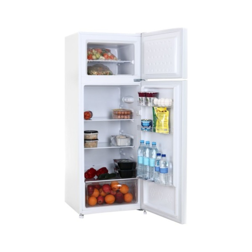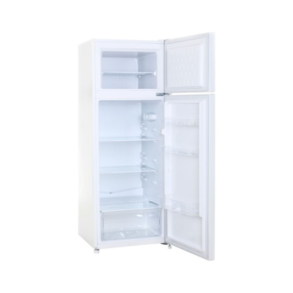 Цей двокамерний холодильник має загальний об'єм 211 літрів, що оптимально підходить для сім'ї або кухонь середніх розмірів. Основний холодильний відсік, об'ємом 170 літрів, оснащений трьома міцними полицями із загартованого скла та трьома дверними корзинами, що дозволяє раціонально організувати простір. Полка для пляшок, вбудована в дверцята, додає ще більше зручності, а контейнер для овочів збереже фрукти та овочі свіжими протягом тривалого часу.