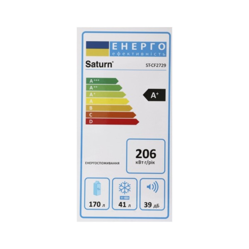 Енергоефективність моделі Saturn ST-CF2729 відповідає класу A+, споживаючи 206 кВт/год, що забезпечує економію на комунальних послугах, не завдаючи шкоди навколишньому середовищу. Робоча продуктивність залишається на висоті навіть при мінімальному споживанні електроенергії.