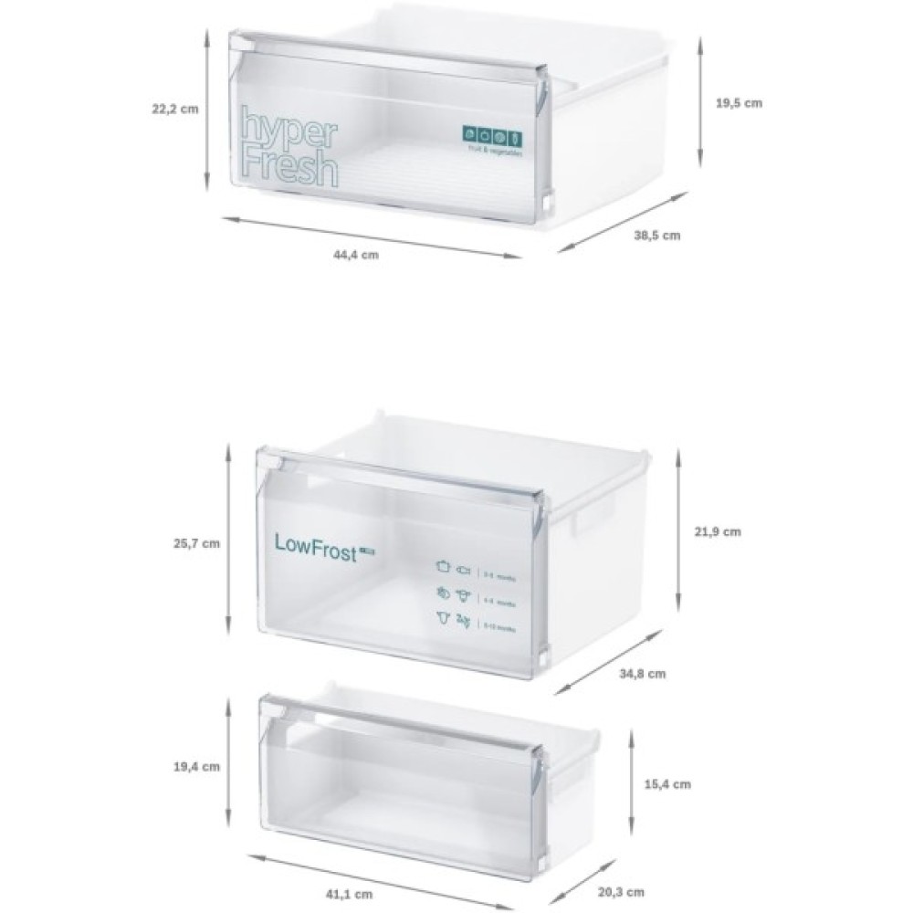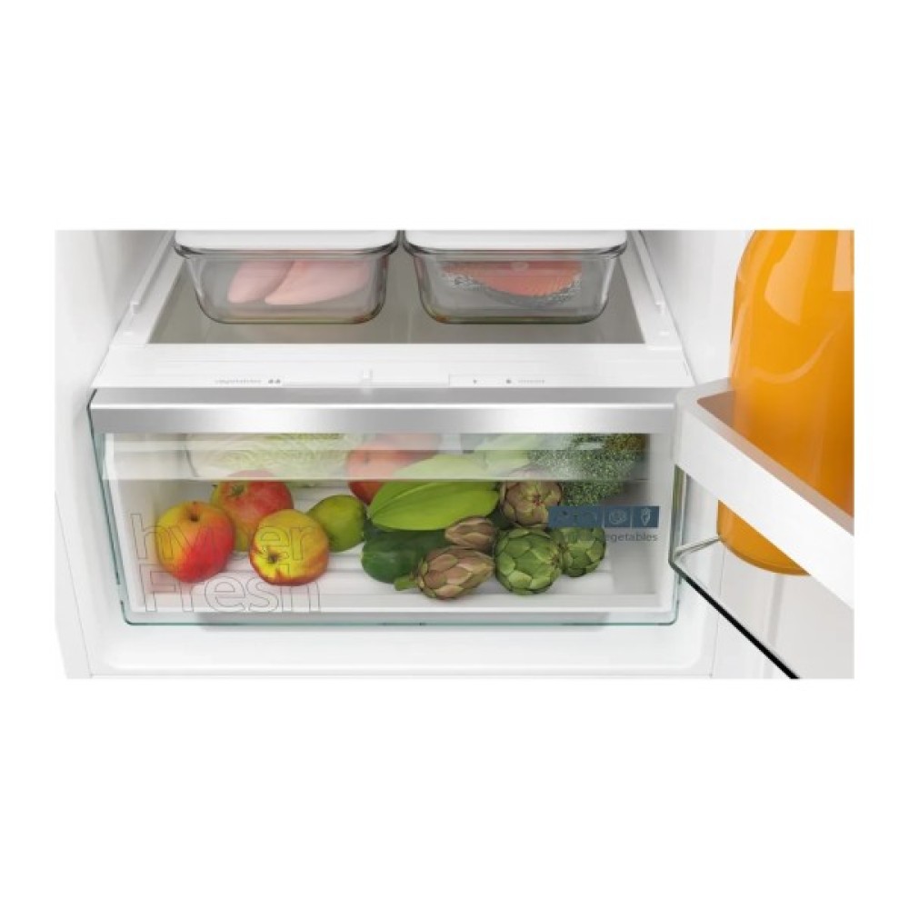 Особливу увагу заслуговує система hyperFresh, яка забезпечує оптимальний мікроклімат у холодильній камері. Спеціальний контейнер для фруктів та овочів підтримує регульований рівень вологості, завдяки якому ваші продукти залишатимуться свіжими та ароматними довше. А з підвісною полицею для пляшок ви зможете зберігати напої без перегороджування простору всередині камери.