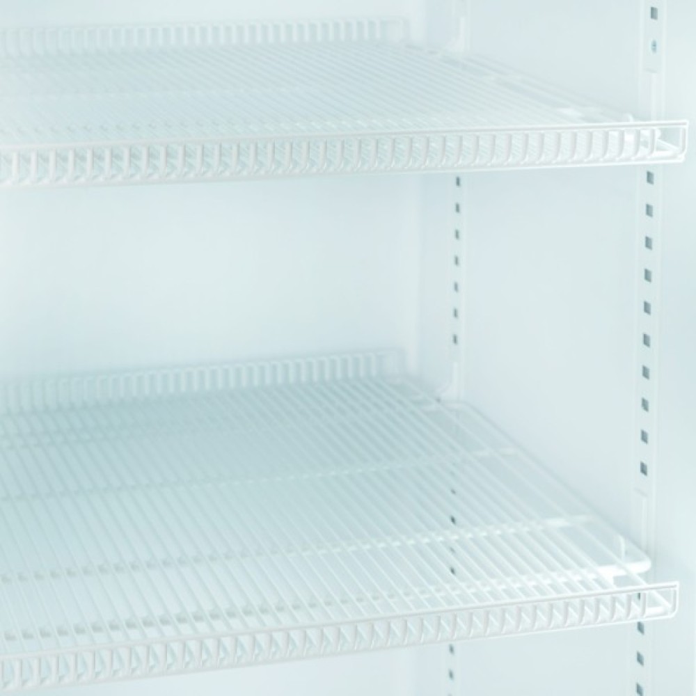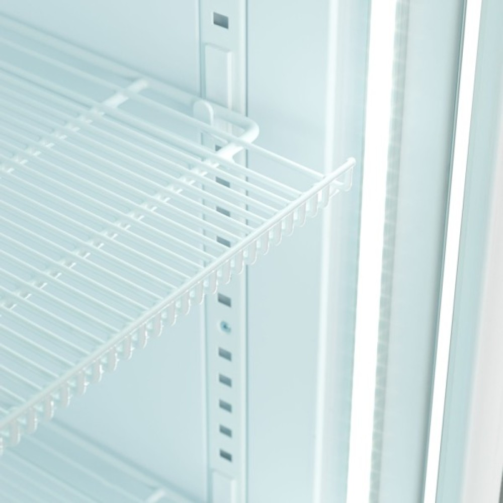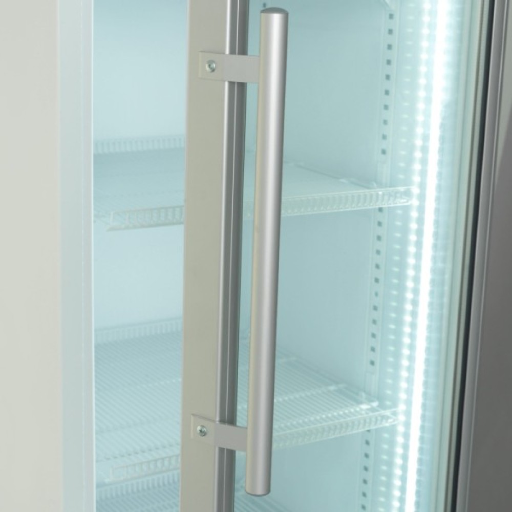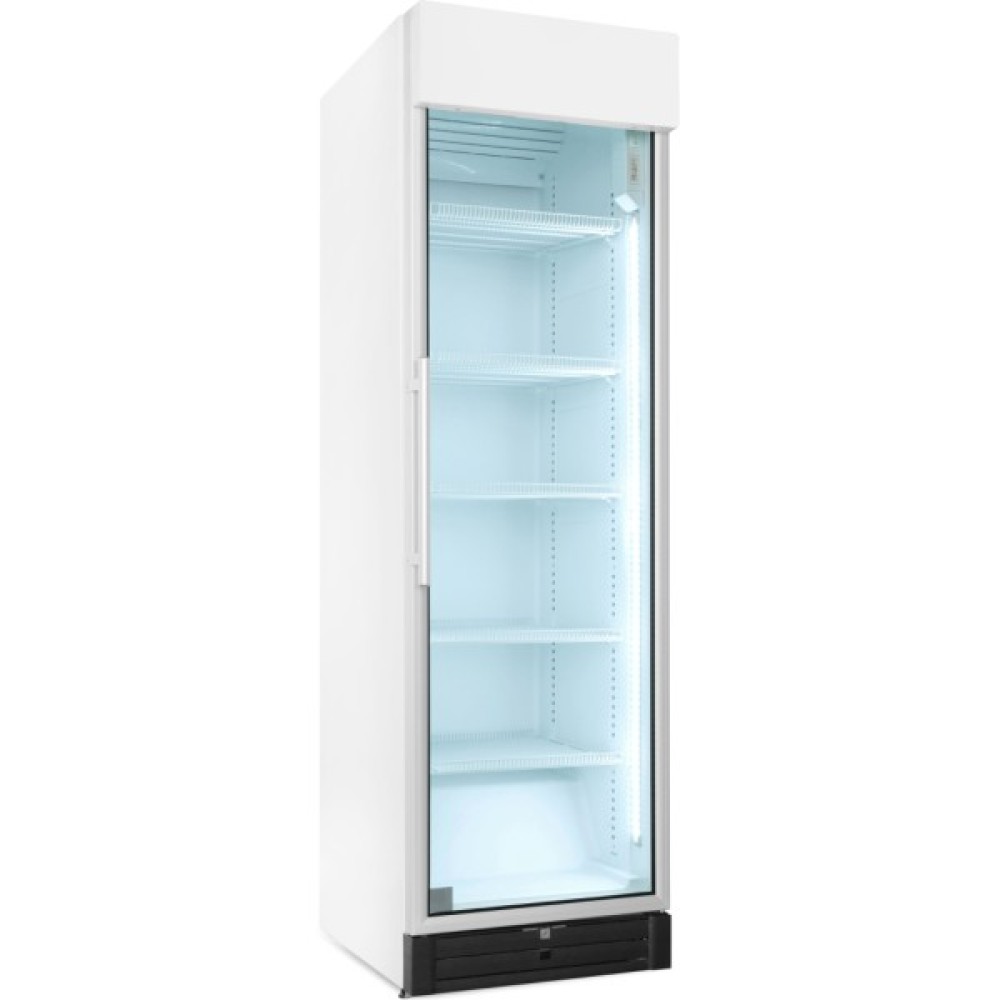 Цей холодильник-шафа-вітрина забезпечує чудову експозицію товарів завдяки своїм скляним дверям та вертикальному світлодіодному підсвічуванню. Це гарантує постійне привертання уваги до вашої продукції, що сприяє збільшенню продажів. З корисним об'ємом холодильної камери 455 літрів ви з легкістю розмістите всі необхідні продукти на п'яти регульованих полицях, що дозволяє оптимізувати простір у холодильнику відповідно до ваших потреб.