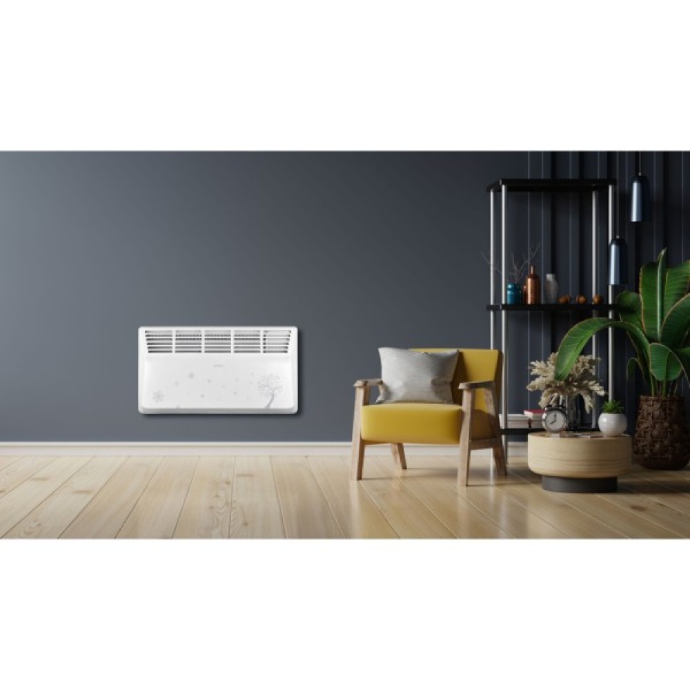 Ця модель зручна у використанні завдяки механічному управлінню, яке дозволяє легко налаштувати необхідний режим роботи, що є особливо важливим у прохолодні дні. Витончений білий дизайн з сучасним візерунком легко доповнить будь-який інтер'єр, а клас захисту IP20 свідчить про надійність та безпечність обігрівача.