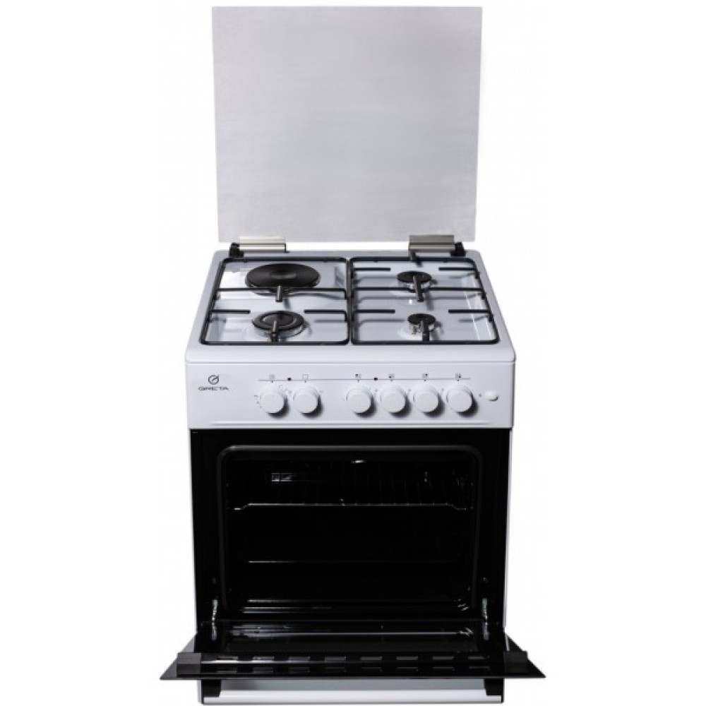 Комбінована плита, комбінована варильна поверхня, 3 газові конфорки, електрозапалювання кнопкою та газ контроль конфорок, 1 електрична чавунна конфорка, решітка хромована, електрична духовка об'ємом 70 л, механічне керування, термостат, підсвічування, ширина 60 см, колір білий.
