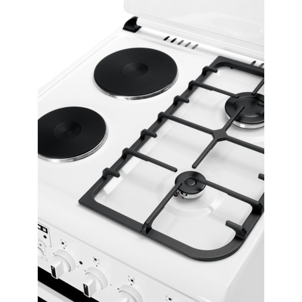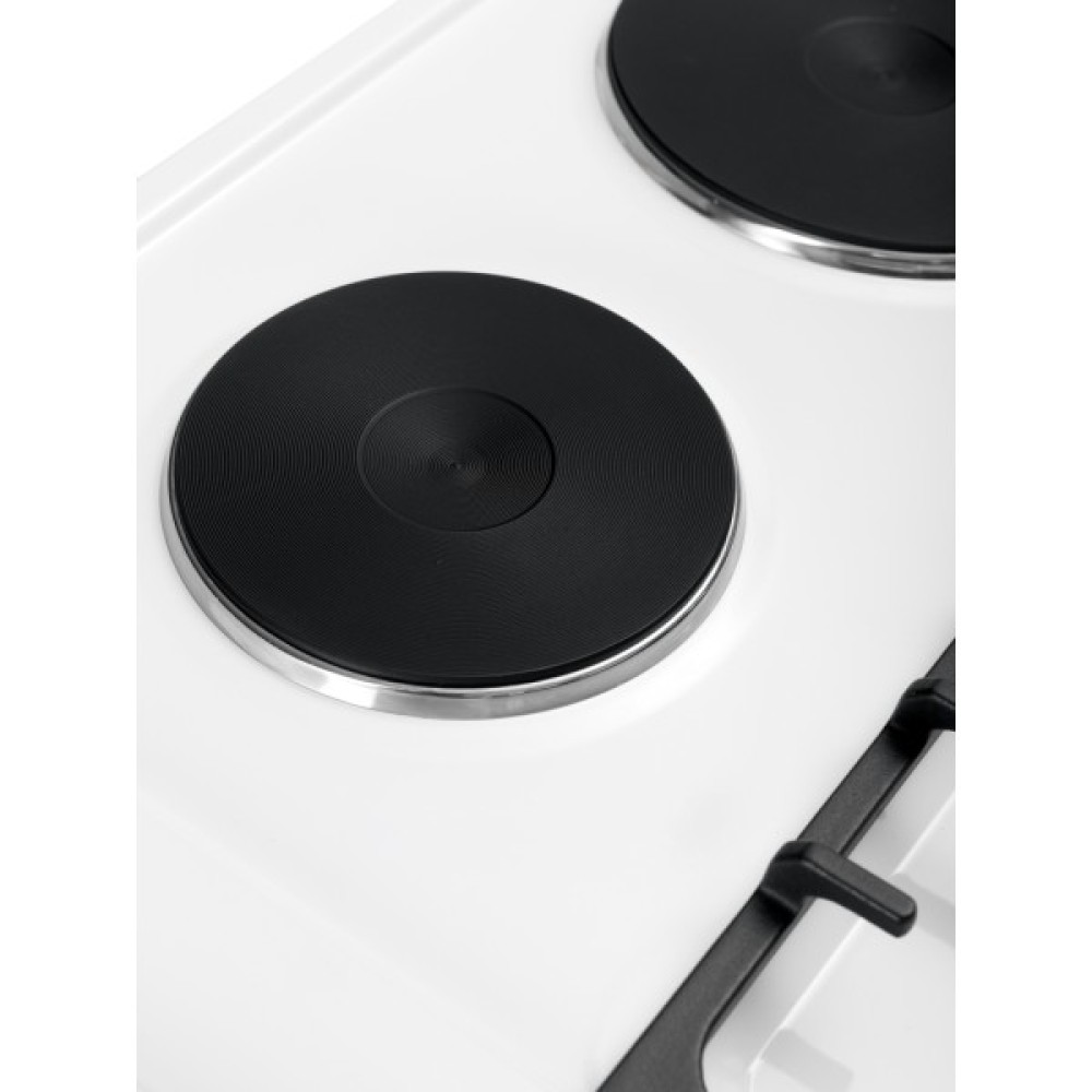 Ця плита оснащена комбінованою варильною поверхнею, що включає дві газові та дві електричні конфорки, що дозволяє готувати різноманітні страви з максимальною зручністю. Перша конфорка потужністю 800 Вт і друга на 1000 Вт забезпечують швидке приготування їжі, тоді як третя конфорка на 1500 Вт і четверта на 1550 Вт підходять для більш складних кулінарних завдань. Емальоване покриття варильної поверхні додає не лише естетичної привабливості, але й забезпечує легкість в очищенні.