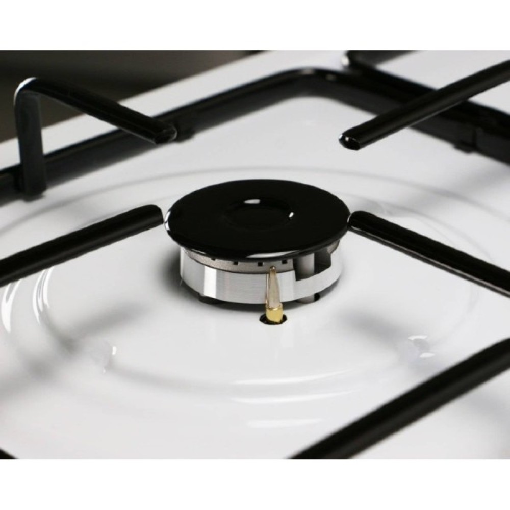 Варильна поверхня обладнана чотирма газовими конфорками з надійними чавунними решітками та скляною кришкою. Для зручності передбачено електрозапалювання кнопкою та систему газ-контролю, яка гарантує безпеку під час роботи.