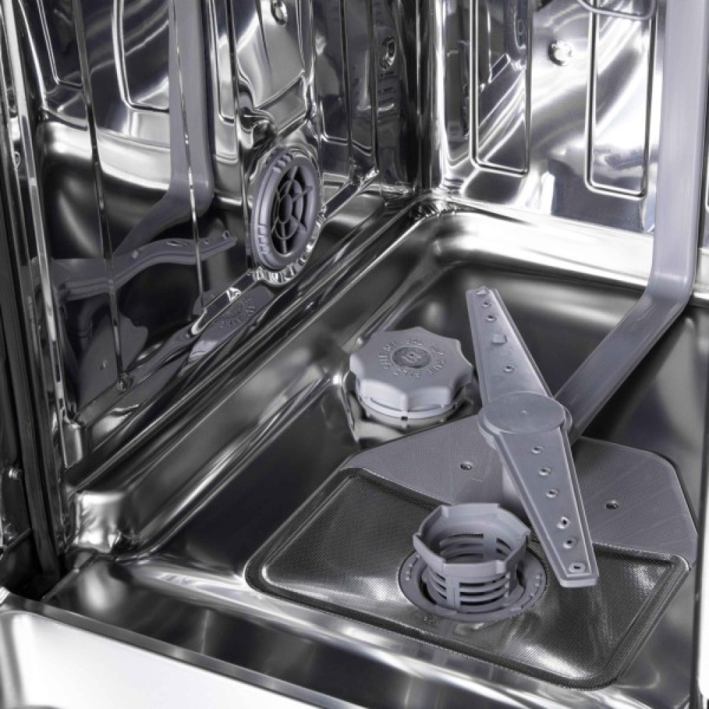 Укладати посуд та столові прибори потрібно правильно, дотримуючись інструкції – це забезпечить ефективне очищення. Для розміщення передбачено регульований верхній кошик, для кухлів – 4 полиці й універсальний знімний кошик для столових приборів. Полиці верхнього та нижнього кошиків є цілісними. Аби правильно визначити необхідний режим, у комплектованні наявна смужка для перевірки жорсткості води.