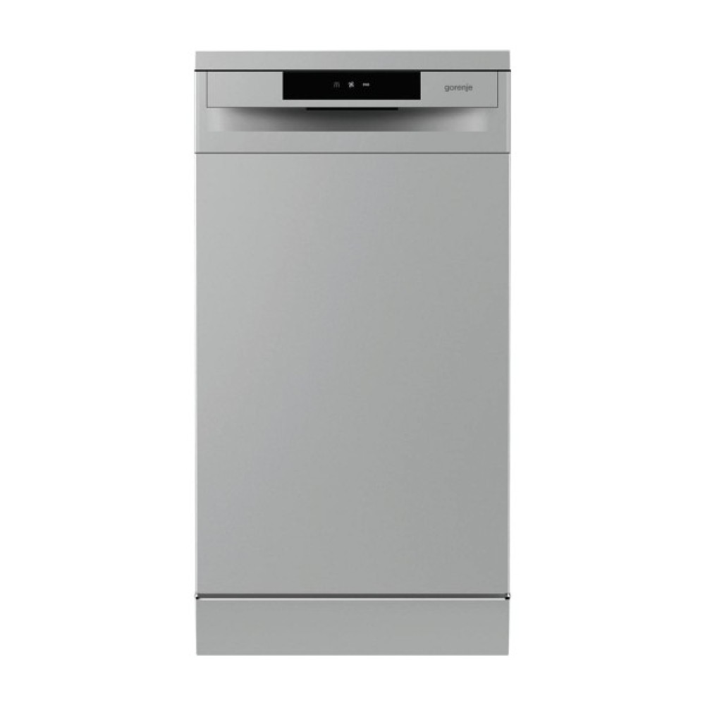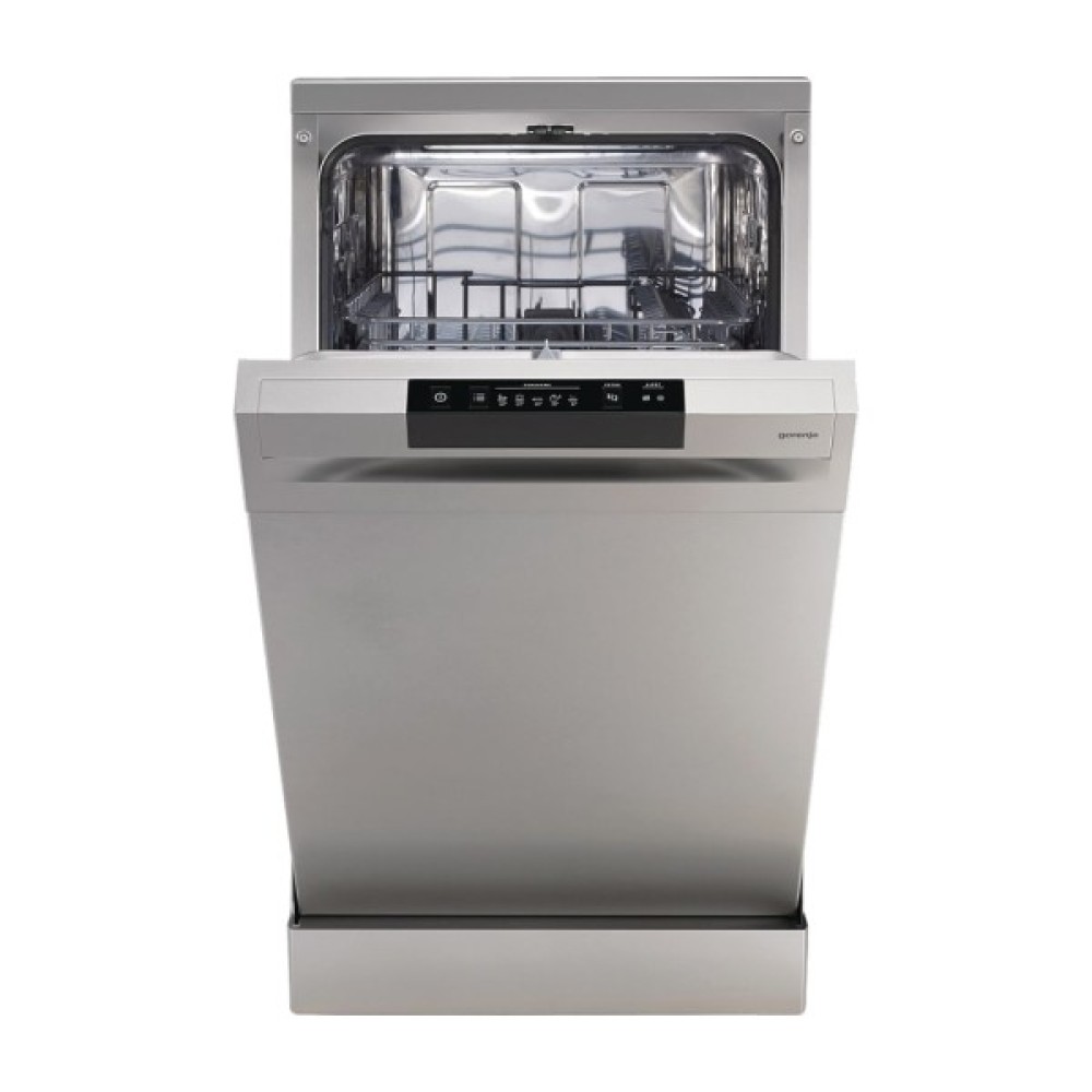 Посудомийна машина Gorenje GS520E15S вузька модель сріблястого кольору. Верхній кошик регулюється за висотою для зручного розміщення посуду різних розмірів. Захист від протікання AquaStop запобігає затопленню в кімнаті, зберігаючи меблі та іншу техніку. Звуковий сигнал після завершення циклу підвищує зручність експлуатації.