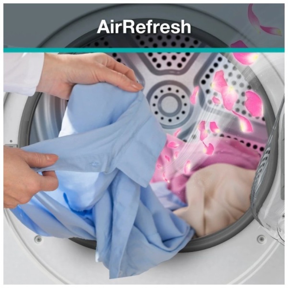 Інтелектуальна система SensorIQ визначає рівень вологості тканин і автоматично підбирає оптимальний час сушіння, запобігаючи пересушуванню. Технологія TwinAir забезпечує двопотоковий розподіл теплого повітря, завдяки чому білизна висихає рівномірно, залишається м’якою і легко прасується. Модель має також функцію Refresh, яка дозволяє освіжити одяг за 10 хвилин без прання, що особливо зручно для ділових костюмів або речей, які зберігалися у шафі.