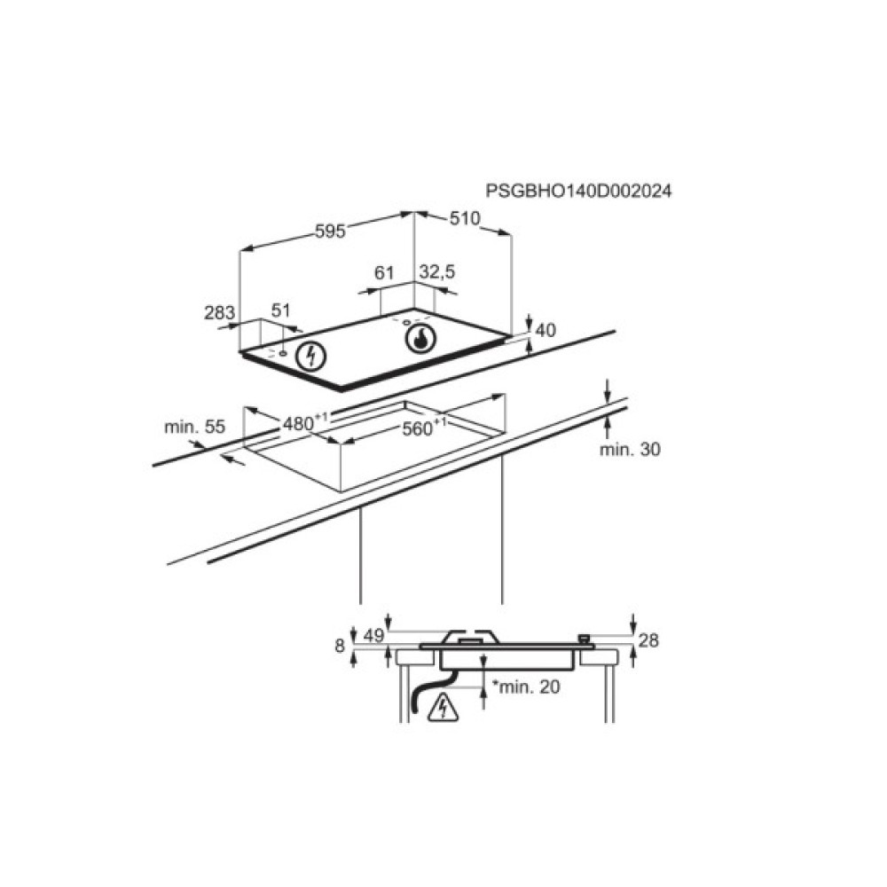 Вмонтовування варильної поверхні не викликає складнощів завдяки розмірам ніші розміром 3 x 56 x 48 см, а сама конструкція, маючи розміри 16 x 68 x 62 см, підходить для невеликих та середніх кухонь.