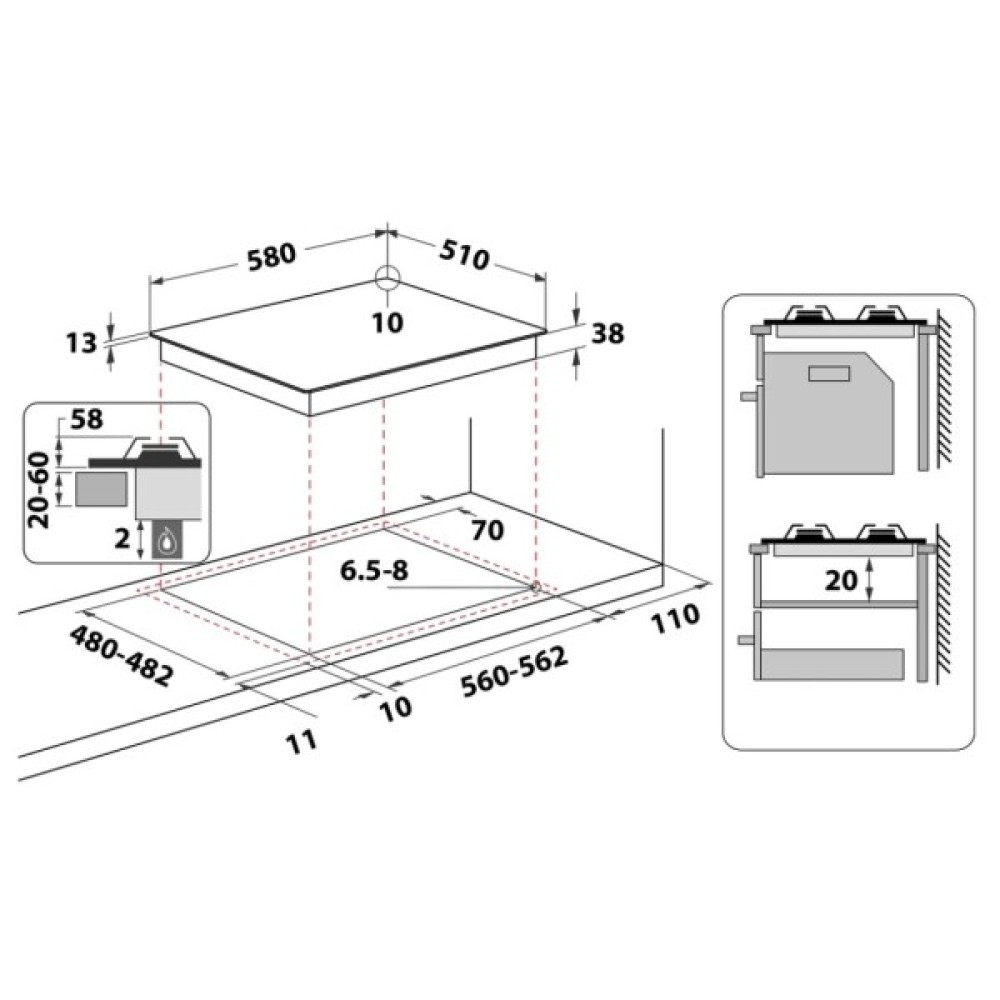 Розміри поверхні складають 58х51 см, що робить її ідеальною для стандартних кухонь. Вузькі розміри для вбудовування (560-562 х 480-482 см) дозволяють легко інтегрувати модель в більшість кухонних просторів, роблячи процес встановлення швидким і простим.