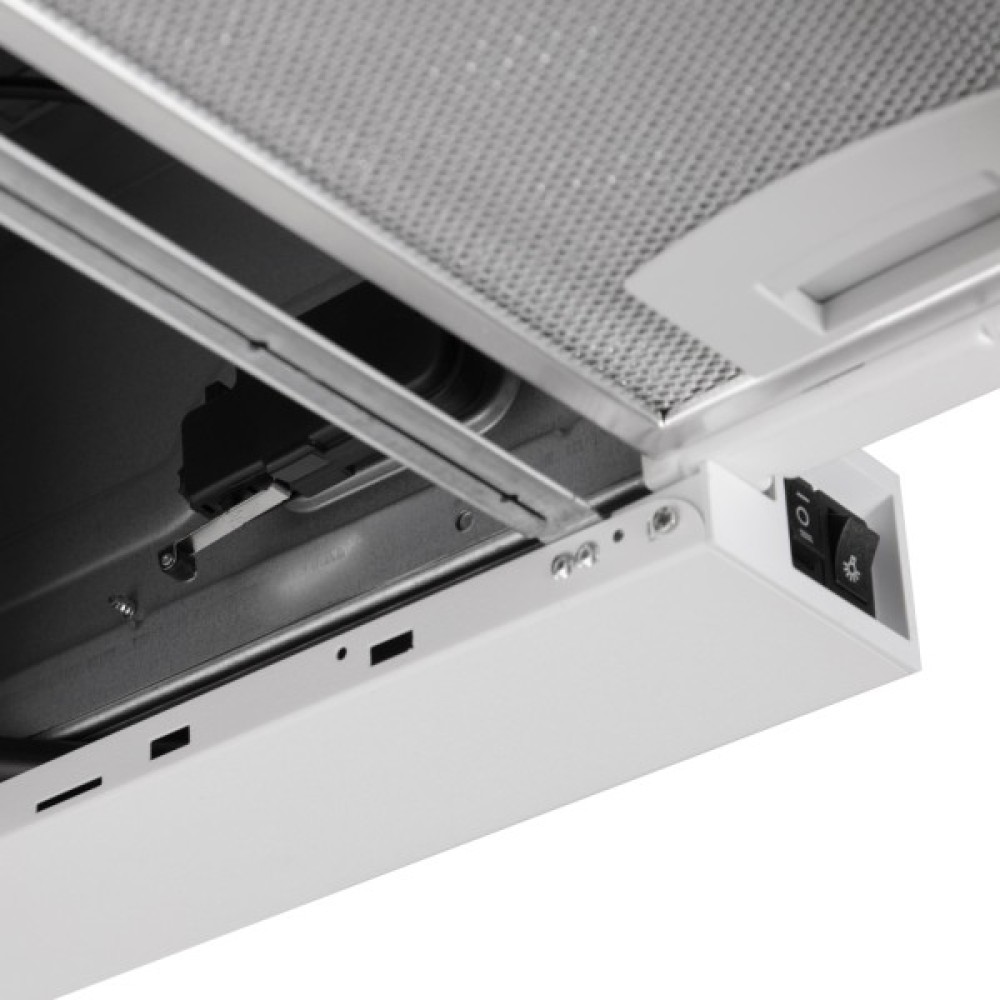 Два тришарові алюмінієві фільтри вловлюють жир і часточки, захищаючи кухонні поверхні. Заслінка запобігає зворотному потоку повітря, а рівень шуму до 59 дБ гарантує комфортну роботу. Дві LED-лампи потужністю 1 Вт кожна достатньо освітлюють варильну поверхню навіть за слабкого основного світла.
