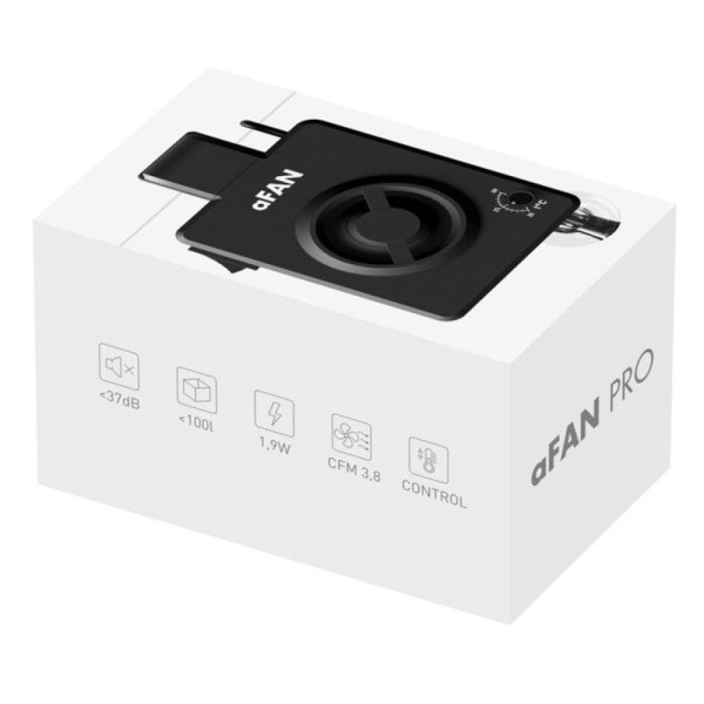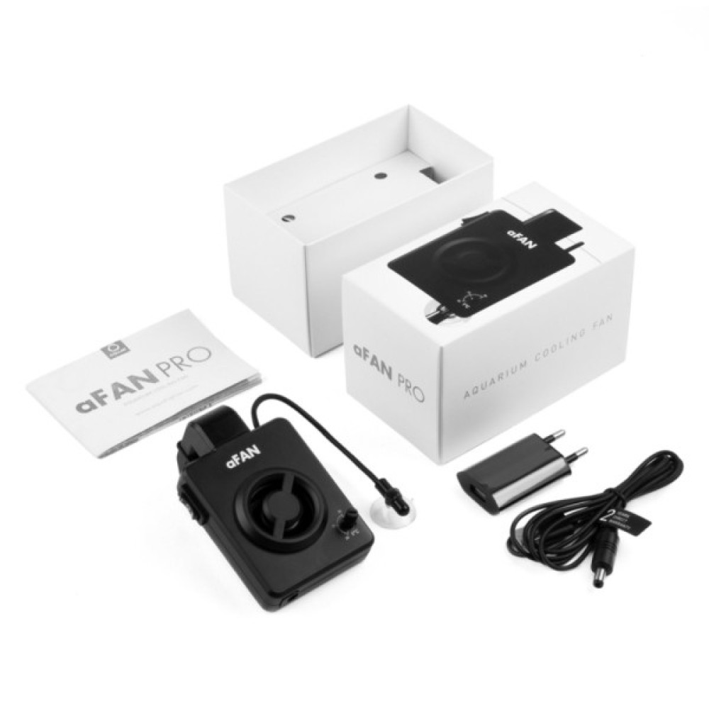 Вентилятор охолодження aFAN PRO розроблений для ефективного і безшумного охолодження акваріумів, а також для організації циркуляції повітря в тераріумах будь-якого типу. Продумане кріплення із зовнішньої сторони акваріума перешкоджає передчасному виходу вентилятора з ладу від підвищеної вологості та корозії, а також дозволяє використовувати його з морськими акваріумами. Має дві швидкості обертання: стандартну і підвищену. Може під’єднуватися до будь-якого роз'єму USB.