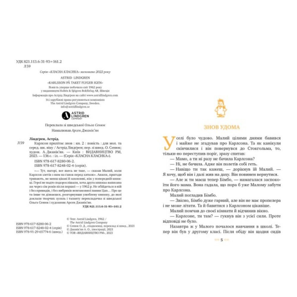 Авжеж, пригоди тривають, не менш цікаві та захопливі, ніж у попередній книжці. Герої не надто постаршали, хоча друга книжка написана, проте, аж через сім років після першої — у 1962 р. Не обійдеться в ній і без привидів, і без вибриків невгамовної фрекен Бок… Але про це та інше ти дізнаєшся сам, узявши до рук улюблену книжку, до якої доклали творчих зусиль і таланту перекладач зі шведської Ольга Сенюк і художник Арсен Джанік’ян.