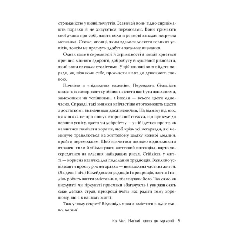 У житті кожної людини трапляються радощі, й прикрощі, злети й падіння. У книжці, яку ви тримаєте в руках, всесвітньо відомий автор Кен Моґі пояснює, чому важливо щиросердо прийняти те, як влаштовано світ, і збалансувати весь здобутий досвід — і позитивний, і негативний. Заглиблюючись в історію, традиції та культуру Японії і надаючи інструментарій, який допоможе отримувати задоволення від життя, автор показує, як кожен із нас може створити наґомі для себе.